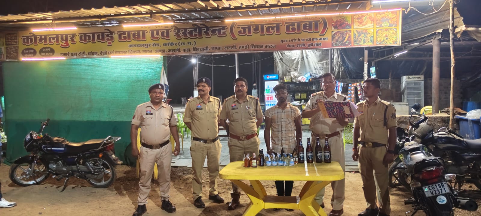 कांकेर 1 अप्रैल 2026(आरएनएस) हाईवे किनारे चल रहे ढाबों पर अवैध शराब का खेल आखिरकार पुलिस के शिकंजे में आ गया, थाना सिटी कोतवाली क्षेत्र में ‘उजियारा’ अभियान के तहत की गई सघन कार्रवाई में पुलिस ने एक साथ कई ढाबों को घेरकर ऐसा धावा बोला कि मौके पर ही शराब परोसने और बेचने का पूरा नेटवर्क उजागर हो गया, 31 मार्च 2026 की इस कार्रवाई में पुलिस टीम ने ग्राम कोमलपुर और गढ़पीछवाड़ी इलाके के ढाबों पर रेड करते हुए कुल 4 आरोपियों को गिरफ्तार किया जिनमें सालिक कावडे (36) निवासी गोर्वधन, बिरेन्द्र कुमार जुर्री (26) निवासी कुकरादाहा, ईश्वर सिंह कावडे (43) निवासी कामलपुर और रविन्द्र साहू (42) निवासी गोविंदपुर शामिल हैं, ये सभी ढाबा संचालक अवैध रूप से शराब बेचने के साथ ग्राहकों को बैठाकर खुलेआम शराब पिलाने का धंधा चला रहे थे, पुलिस को मुखबिर और अभियान के दौरान मिली सूचना के आधार पर थाना प्रभारी बनसोडे प्रतिक दादासाहेब के नेतृत्व में टीम गठित की गई और हाईवे किनारे स्थित ‘सालिक ढाबा’, ‘कोमलपुर कावडे ढाबा एवं रेस्टोरेंट’ और ‘कुंवर दादरा ढाबा’ को चारों ओर से घेरकर दबिश दी गई, जैसे ही पुलिस अंदर पहुंची तो वहां शराब की बोतलों का जखीरा मिला, मौके से देशी और अंग्रेजी शराब मिलाकर कुल 10.52 लीटर मदिरा बरामद की गई जिसकी कीमत करीब 5 हजार रुपये आंकी गई, सालिक ढाबा से 20 पौवा देशी शराब और नगद 240 रुपये जबकि कावडे ढाबा से देशी प्लेन, गोल्डन गोवा, बैगपाइपर, मूडऑफ और थंडर बोल्ट बीयर जैसी विभिन्न ब्रांड की शराब जब्त की गई, पुलिस ने पूरे मामले में आबकारी एक्ट की धारा 34(1)(ख), 34(2) और 36(ए) के तहत अपराध क्रमांक 116/2026, 117/2026 और 119/2026 दर्ज कर आरोपियों के खिलाफ कानूनी कार्रवाई शुरू कर दी है, इस पूरी कार्रवाई को पुलिस अधीक्षक निखिल राखेचा के निर्देशन में अंजाम दिया गया, जिसमें उप निरीक्षक सुरेन्द्र मानिकपुरी, डी.आर. साहू, सोमेन्द्र सिंह, तेजेश्वर कश्यप समेत बड़ी टीम शामिल रही, कांकेर पुलिस ने साफ संदेश दिया है कि हाईवे हो या शहर, कहीं भी अवैध शराब का कारोबार बर्दाश्त नहीं किया जाएगा और ‘उजियारा’ अभियान लगातार जारी रहेगा, साथ ही पुलिस ने आम जनता से अपील की है कि किसी भी संदिग्ध गतिविधि की सूचना हेल्पलाइन 94791-55125 पर दें, आपकी एक सूचना बड़े अपराध को रोक सकती है ।