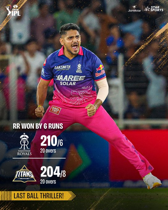 नईदिल्ली,05 अपै्रल। इंडियन प्रीमियर लीग 2026 के 9वें मैच में राजस्थान रॉयल्स ने करीबी मुकाबले में गुजरात टाइटन्स को 6 रनों से हरा दिया. गुजरात आखिरी दो ओवर में 15 रन नहीं बना सके, जिसका सबसे ज्यादा क्रेडिट जोफ्रा आर्चर और तुषारदेश पांडे को जाता है. आर्चर ने 19वें ओवर में केवल 4 रन दिए, जिसकी वजह से गुजरात को आखरी ओवर में 11 रनों की जरूरत थी, लेकिन तुषार ने पहली गेंद वाइड फेंकने के बावजूद केवल 4 रन ही खर्च किए.