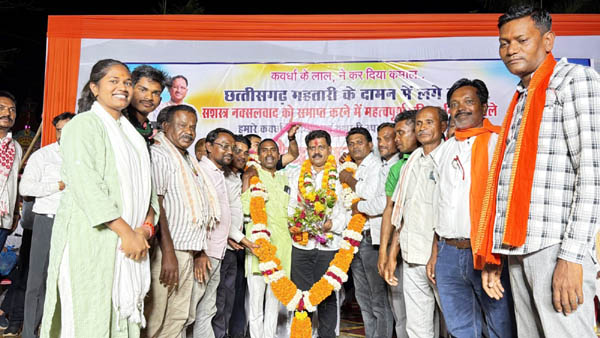 इस अभियान में भारतीय सेना, पुलिस और समस्त सशस्त्र बलों के जवानों के अदम्य साहस, समाज की जागरूक भागीदारी, राजनीतिक नेतृत्व की इच्छाशक्ति, पत्रकार बंधुओं की भूमिका और सबसे बढ़कर बस्तर के नागरिकों के सहयोग का महत्वपूर्ण योगदान रहा। सभी के समुचित प्रयासों से ही सशस्त्र नक्सलवाद का अंत संभव हो सका और अब बस्तर में खुशहाली की नई शुरुआत हो रही है। सशस्त्र नक्सलवाद से मुक्त छत्तीसगढ़ बनने के बाद उप मुख्यमंत्री एवं गृह मंत्री विजय शर्मा रविवार को अपने विधानसभा क्षेत्र कवर्धा पहली बार पहुंचे। जहां पर स्थानीय महामाया चौक में कवर्धा के लोगों ने उनके लिए भव्य ऐतिहासिक नागरिक अभिनंदन समारोह आयोजित किया। जिसमें हजारों की संख्या में लोग बाजा-गाजा, ढोल-नगाड़ों के साथ शामिल हुए, पूरे शहर में जश्न का वातावरण नजर आया। सभी को गर्व था कि कभी नक्सल प्रभावित कबीरधाम जिले के साथ अब पूरे छत्तीसगढ़ से भय और आतंक को दूर करने में उनके अपने माटी पुत्र का बड़ा योगदान रहा है। इस कार्यक्रम में ब्राह्मण समाज, यादव समाज, ठाकुर समाज, कुर्मी समाज, साहू समाज, सतनामी समाज, निर्मलकर समाज, गुप्ता समाज, अहिरवार समाज, लोधी समाज, पटेल समाज, गोंड समाज, केसरवानी गुप्ता समाज, सेन समाज, गंधर्व समाज, स्वर्णकार समाज, जैन समाज, वैष्णव समाज सहित सभी समाजों ने भव्य रैली का स्वागत कर इस असंभव से लगने वाले लक्ष्य की प्राप्ति के लिए उन्हें शुभकामनाएं दी। जहां स्थानीय जिला प्रेस क्लब, यूथ क्लब, हरीतिमा परिवार, प्राइवेट स्कूल संघ, नाथ योगी समाज, फाइटर क्लब, जिला क्रिकेट संघ, ज्वाइन हैंड ग्रुप, ट्रक मालिक संघ, पतंजलि योग समिति, सीनियर सिटीजन समिति एवं भारतीय जनता पार्टी के पदाधिकारी व कार्यकर्ताओं ने भी शामिल होकर उनका अभिनंदन किया। इस अवसर पर सभी ने गृह मंत्री विजय शर्मा को लड्डुओं से तौलकर उनका सम्मान किया। इस अवसर पर उप मुख्यमंत्री शर्मा ने गायत्री मंदिर और गुरुद्वारे में जाकर प्रदेश की शांति और समृद्धि की प्रार्थना की और लोगों के साथ भारतमाता चौक पर नक्सल अभियान में शहीद हुए अमर जवानों को श्रद्धांजलि दी। उन्होंने कहा कि मैं आप सभी के प्रेम से अभिभूत हूँ। मुझे नहीं पता था कि आप सब नक्सल समस्या को इतनी गंभीरता से समझते हैं। यह वास्तव में अत्यंत संवेदनशील विषय रहा है, और जो लोग इससे पीडि़त रहे हैं, उनकी पीड़ा को शब्दों में समझा भी नहीं जा सकता। माओवाद एक आयातित विचार है, जिसका उद्देश्य केवल बंदूक की नली से सत्ता स्थापित करना रहा है, जबकि भारत का लोकतंत्र प्राचीन काल से ही सशक्त रहा है, जिसकी झलक आज भी बस्तर के समाज में दिखाई देती है। उन्होंने नक्सल हिंसा की भयावहता का उल्लेख करते हुए कहा कि भोले-भाले लोगों को बहलाकर उनके हाथों मे