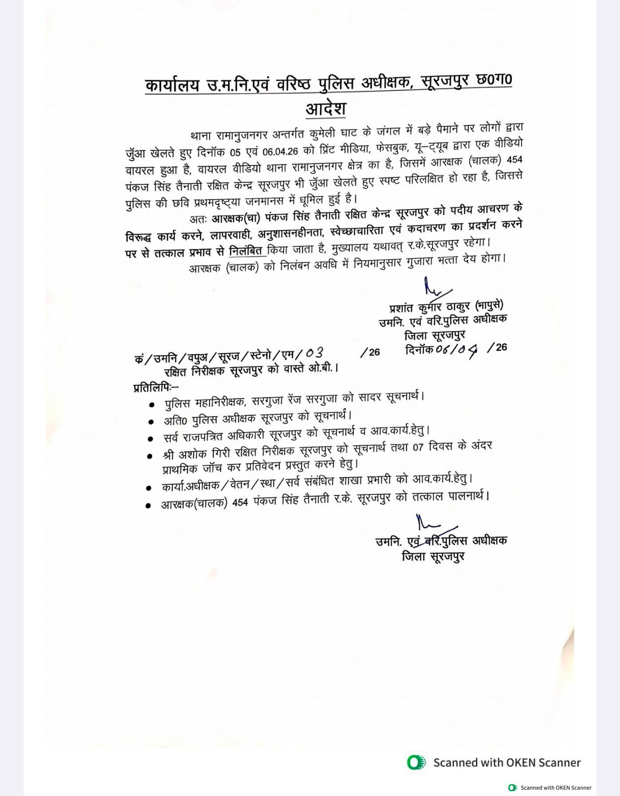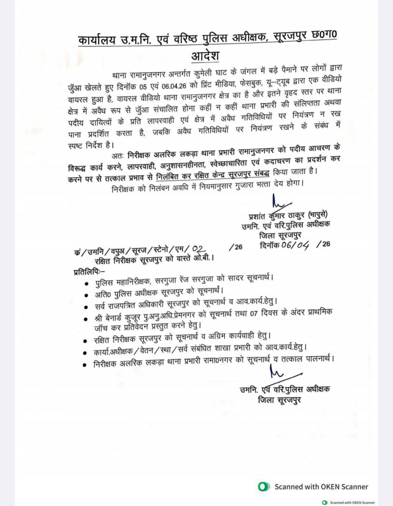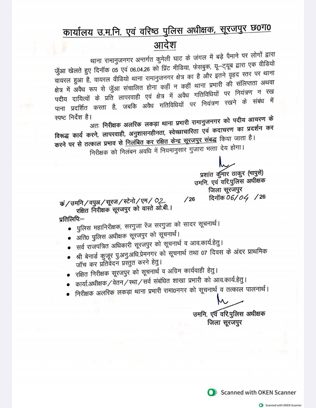 सूरजपुर, 06 अप्रैल (आरएनएस)। जिले के रामानुजनगर थाना क्षेत्र में वायरल हुए जुआ खेलने के वीडियो के बाद पुलिस विभाग ने सख्त कदम उठाया है। कर्तव्य में लापरवाही के आरोप में रामानुजनगर थाना प्रभारी अलरिक लकड़ा को निलंबित कर लाइन अटैच किया गया है। वहीं आरक्षक पंकज सिंह को भी निलंबित कर दिया गया है।