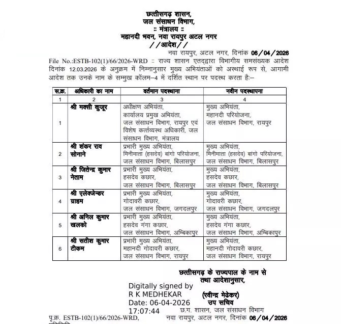 रायपुर, 07 अप्रैल (आरएनएस)। छत्तीसगढ़ शासन के जल संसाधन विभाग में बड़े स्तर पर प्रशासनिक फेरबदल किया गया है। इस संबंध में जल संसाधन विभाग ने आदेश जारी किया है। जारी आदेश में प्रमुख अभियंता से लेकर कई मुख्य अभियंताओं को नई जिम्मेदारियां सौंपी गई हैं। जारी आदेश के अनुसार, शंकर ठाकुर (मुख्य अभियंता, सिविल) को अस्थायी रूप से आगामी आदेश तक प्रमुख अभियंता, जल संसाधन विभाग का प्रभार सौंपा गया है। साथ ही 6 मुख्य अभियंताओं की नई पदस्थापना की गई है। इन मुख्य अभियंताओं को मिली नई पोस्टिंग मक्सी कुजूर को मुख्य अभियंता, महानदी परियोजना, रायपुर बनाया गया है। शंकर राव सोने को मुख्य अभियंता, मिनीमाता (हसदेव) बांगो परियोजना, बिलासपुर की जिम्मेदारी दी गई है। जितेन्द्र कुमार नेताम को मुख्य अभियंता, हसदेव कछार, बिलासपुर पदस्थ किया गया है। अलेक्जेंडर ग्राहम को मुख्य अभियंता, गोदावरी कछार, जगदलपुर बनाया गया है। अनिल कुमार खलको को मुख्य अभियंता, हसदेव गंगा कछार, अंबिकापुर की जिम्मेदारी सौंपी गई है। सतीश कुमार टीकम को मुख्य अभियंता, महानदी-गोदावरी कछार, रायपुर पदस्थ किया गया है।