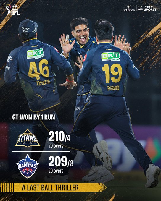 नईदिल्ली, 09 अपै्रल। इंडियन प्रीमियर लीग 2026 के सबसे रोमांचक मैच में दिल्ली को एक रन से हार का सामना करना पड़ा. अरुण जेटली स्टेडियन में खेले गए मैच में गुजरात टाइटन्स ने 20 ओवर में 4 विकेट खोकर 210 रन बनाए, जवाब में दिल्ली कैपिटल्स 20 ओवर में 8 विकेट खोकर 209 रन ही बना सकी.