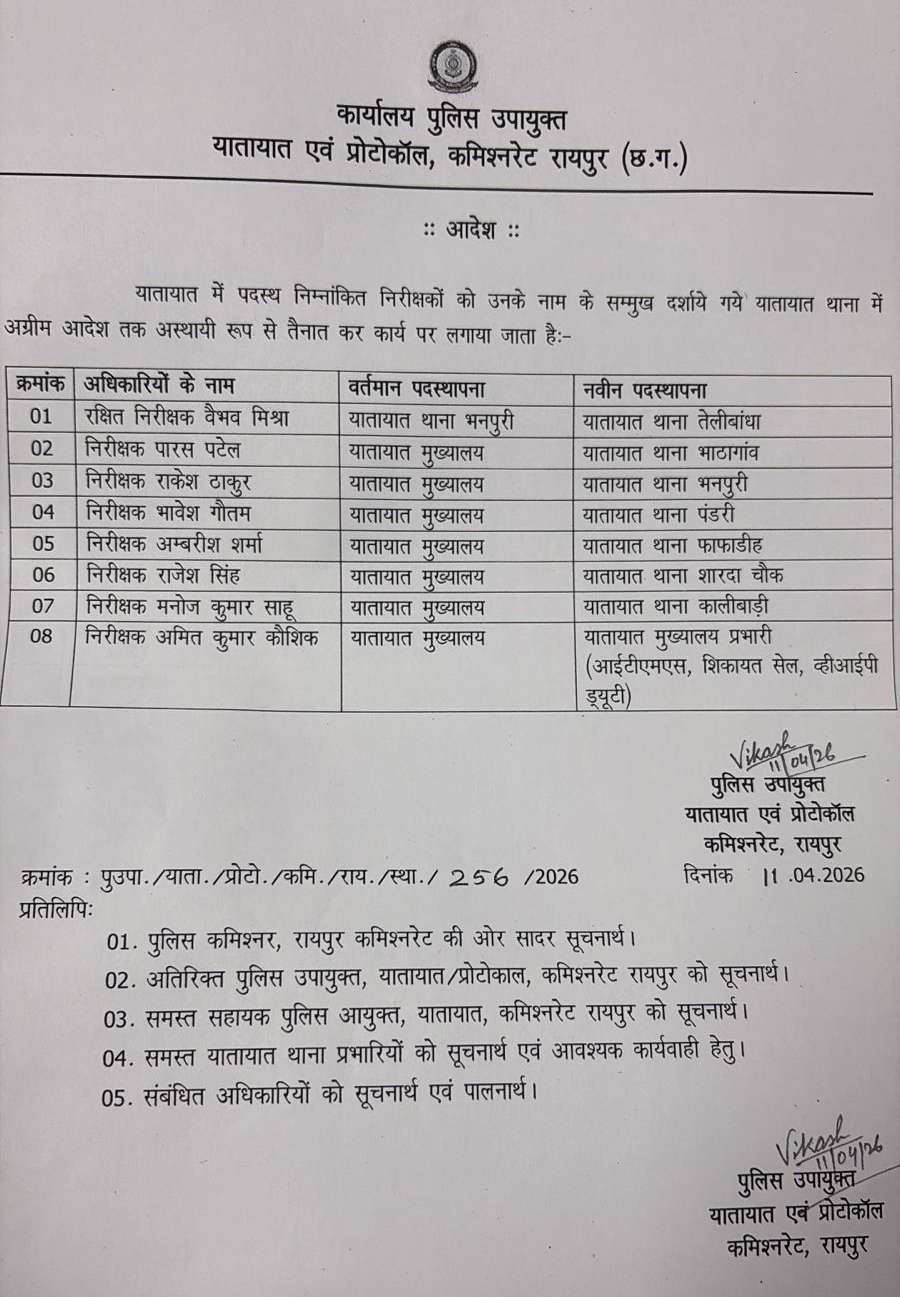 रायपुर, 11 अप्रैल (आरएनएस)। राजधानी में यातायात व्यवस्था को दुरुस्त करने के लिए पुलिस विभाग ने बड़ा प्रशासनिक कदम उठाया है। रायपुर कमिश्नरेट ने एक आदेश जारी कर शहर के 8 यातायात थाना प्रभारियों का तबादला कर दिया है।आदेश के मुताबिक, वैभव मिश्रा को भनपुरी यातायात थाना से हटाकर तेलीबांधा यातायात थाना का नया प्रभारी बनाया गया है। इसके साथ ही कालीबाड़ी, भनपुरी, भाटागांव और तेलीबांधा समेत कुल 8 थानों में प्रभारियों की जिम्मेदारियों में बदलाव किया गया है।यह आदेश यातायात पुलिस उपायुक्त (डीसीपी) विकास कुमार द्वारा जारी किया गया है। आदेश जारी होते ही विभाग में नई तैनाती की प्रक्रिया शुरू कर दी गई है और सभी अधिकारियों को जल्द से जल्द नई जिम्मेदारी संभालने के निर्देश दिए गए हैं।पुलिस अधिकारियों के अनुसार, यह तबादला प्रशासनिक आधार पर किया गया है, ताकि शहर में बढ़ते ट्रैफिक दबाव को नियंत्रित किया जा सके और यातायात व्यवस्था को और अधिक सुचारू बनाया जा सके।माना जा रहा है कि इस फेरबदल से ट्रैफिक मैनेजमेंट में सुधार आएगा और आम जनता को राहत मिलेगी।