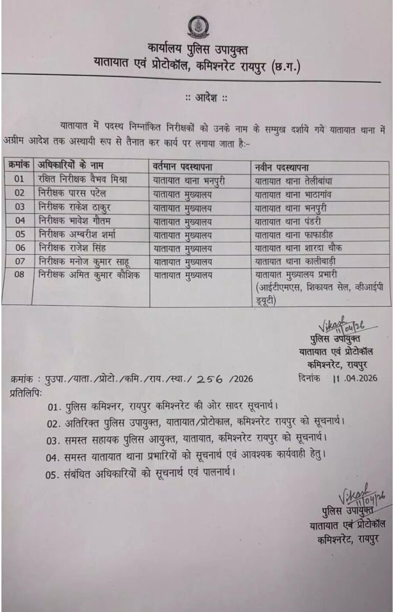 रायपुर, 11 अप्रैल (आरएनएस)। छत्तीसगढ़ की राजधानी रायपुर में यातायात व्यवस्था को और अधिक सुदृढ़ बनाने के उद्देश्य से बड़ा प्रशासनिक फेरबदल किया गया है। पुलिस विभाग द्वारा जारी आदेश के अनुसार शहर में पदस्थ 8 यातायात प्रभारियों के तबादले कर दिए गए हैं।