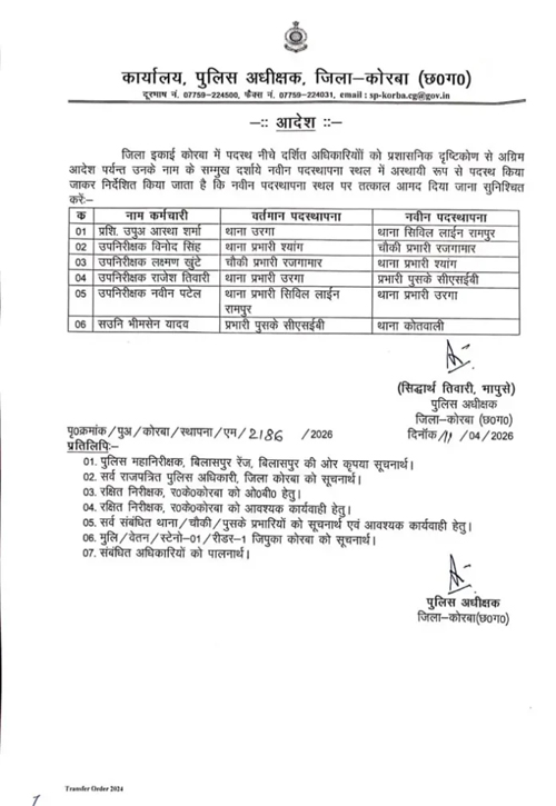 कोरबा 12 अप्रैल (आरएनएस)। जिले में कानून व्यवस्था को और अधिक सुदृढ़ करने के उद्देश्य से पुलिस अधीक्षक सिद्धार्थ तिवारी ने बड़ा प्रशासनिक फेरबदल किया है। इस बदलाव के तहत कई थाना प्रभारियों को इधर से उधर किया गया है और उन्हें नई जिम्मेदारियां सौंपी गई हैं।