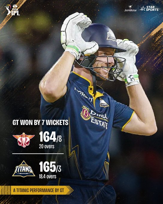 नईदिल्ली, 13 अपै्रल। कप्तान शुभमन गिल और जोस बटलर की अर्धशतकीय पारियों की बदौलत गुजरात टाइटन्स ने लखनऊ सुपर जायंट्स को उन्हीं के घर में 7 विकेट से मात दे दी. गुजरात ने 165 रनों के लक्ष्य को 18.4 ओवर में 3 विकेट खोकर ही हासिल कर लिया. जिसमें गिल के 40 गेंद में 56 और बटलर के 37 गेंद में 60 रन सबसे महत्वपूर्ण थे. लखनऊ की तरफ से मोहम्मद शमी, प्रिंस यादव और दिग्विजय सिंह राठी ने एक-एक विकेट हासिल किए.