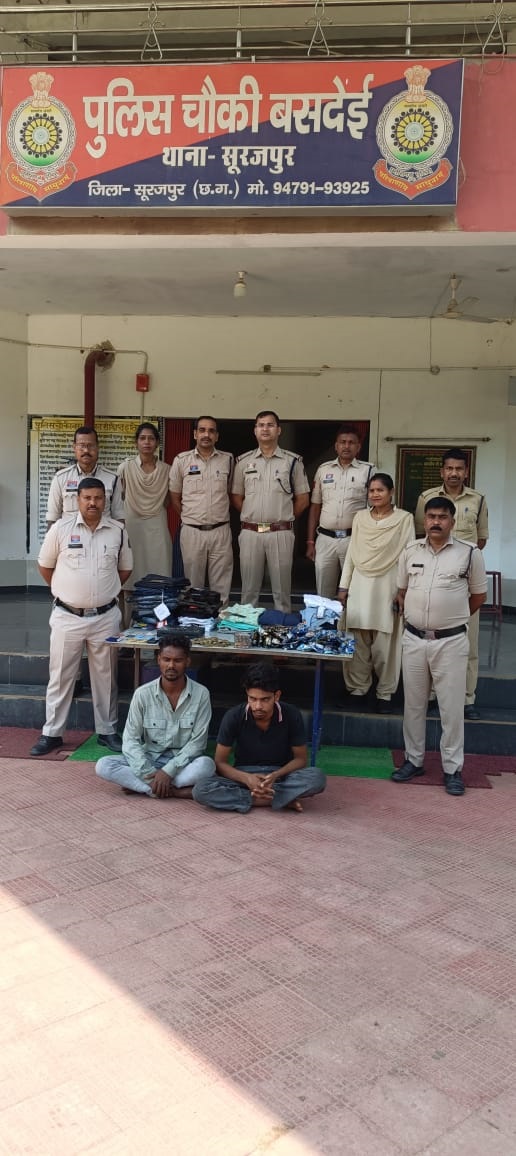 सूरजपुर,13 अप्रैल (आरएनएस) । दिनांक 12.03.2026 को ग्राम सोनपुर निवासी सदीक मोहम्मद ने चौकी बसदेई में रिपोर्ट दर्ज कराया कि इसका सोनपुर मेन रोड़ में किराना एवं रेडिमेट कपड़ा दुकान है। दिनांक 11.04.2026 को रात्रि में दुकान बंद कर घर चला गया, दिनांक 12.03.2026 की सुबह दुकान खोलकर देखा तो दुकान के पीछे तरफ का दरवाजा खुला था और पीछे का हार्डवेस्टर सीट उखड़ा और सामान बिखरा हुआ था, वहां लगे सीसीटीव्ही का डीव्हीआर नहीं था, दुकान का सामान गुटखा-सिगरेट, बैंक एटीएम, क्रेडिट कार्ड, पेन, आधार कार्ड, गल्ला में रखा नगदी 6 हजार रूपये, 2 सोने के कंगन को अज्ञात चोर चोरी कर ले गए। प्रार्थी की रिपोर्ट पर अपराध क्रमांक 238/26 धारा 305(क), 331(4), 111, 3(5) बीएनएस के तहत मामला पंजीबद्ध किया गया।मामले की सूचना पर डीआईजी व एसएसपी सूरजपुर प्रशांत कुमार ठाकुर ने चोरी का जल्द खुलासा कर आरोपी को पकडऩे के निर्देश दिए। चौकी बसदेई पुलिस ने मामले की विवेचना कर चोर की पतासाजी करने में लगी थी इसी बीच मुखबीर से सूचना मिली कि ग्राम शिवप्रसादनगर के राहुल व मानसाय दोनों रात्रि में घुम रहे थे दोनों पूर्व में हदीस के दुकान में चोरी किए थे जिसके बाद दोनों संदेहियों को पकड़ा गया। पूछताछ पर दोनों ने किराना एवं रेडिमेट दुकान में चोरी करना स्वीकार किया जिनके निशानदेही पर सीसीटीव्ही का डीव्हीआर 1 नग, नगदी 11140 रूपये, जीन्स पेंट 11 नग, शर्ट 13 नग, लोअर 3, सेरवानी 1 सेट, कोट 1 नग, गुटखा, सिगरेट, एटीएम व क्रेडिट कार्ड, पेन-आधार कार्ड, सोने का कंगन 2 नग कुल कीमत 93 हजार रूपये जप्त किया गया। आरोपी पूर्व में भी चोरी के मामले में चालान हो चुके है। मामले में संगठित अपराध घटित करने से प्रकरण में धारा 111 बीएनएस जोड़ते हुए आरोपी राहुल सोनवानी पिता माधव राम सोनवानी उम्र 19 वर्ष ग्र्र्राम शिवप्रसादनगर व मानसाय खरसनिहां पिता गोलन राम खरसनिहां उम्र 29 वर्ष सा. शिवप्रसादनगर चौकी बसदेई को गिरफ्तार किया गया। ार्यवाही सीएसपी सूरजपुर बेनार्ड कुजूर के मार्गदर्शन में चौकी प्रभारी बसदेई योगेन्द्र जायसवाल, प्रधान आरक्षक महेन्द्र सिंह, आरक्षक देवदत्त दुबे, महेन्द्र प्रताप सिंह, अभय तिवारी, निलेश जायसवाल, राकेश सिंह, आदित्य यादव, अशोक सिंह, अनिल विश्वकर्मा व अशोक केंवट सक्रिय रहे।
