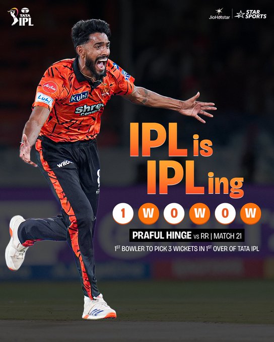नईदिल्ली, 14 अपै्रल। विदर्भ के तेज गेंदबाज प्रफुल्ल हिंगे का आईपीएल डेब्यू शानदार रहा. उन्होंने अपने और पारी के पहले ही ओवर में तीन विकेट लेकर इतिहास रच दिया. जिसके साथ वो आईपीएल में ऐसा करने वाले पहले गेंदबाज बन गए. उन्होंने ये कारनामा सोमवार (13 अप्रैल) को राजीव गांधी इंटरनेशनल स्टेडियम में राजस्थान रॉयल्स के खिलाफ आईपीएल 2026 के मैच में सनराइजर्स हैदराबाद के लिए खेलते हुए अंजाम दिया.