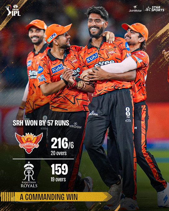नईदिल्ली, 14 अपै्रल। दो युवा तेज गेंदबाज-प्रफुल्ल हिंगे और साकिब हुसैन-के दमदार प्रदर्शन की वजह से सनराइजर्स हैदराबाद ने राजस्थान रॉयल्स को 57 रनों से हरा दिया. 216 रनों के जवाब में राजस्थान की पूरी टीम 19 ओवर में 159 रन पर ही ऑलआउट हो गई. जिसका पूरा क्रेडिट अपना पहला आईपीएल मैच खेलने वाले विदर्भ के प्रफुल्ल हिंगे और बिहार के साकिब हुसैन को जाता है, दोनों ही तेज गेंदबाजों ने 4-4 विकेट लिए.