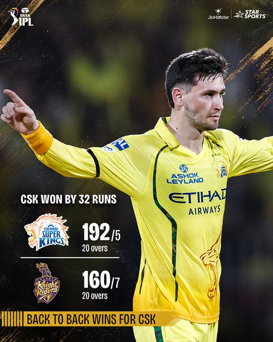 नईदिल्ली, 15 अपै्रल। इंडियन प्रीमियर लीग 2026 के 22वें मैच में चेन्नई सुपर किंग्स ने कोलकाता नाइट राइडर्स को 32 रनों से हरा दिया. जहां ये केकेआर की इस सीजन लगातार चौथी हार है तो वहीं ये सीएसके की लगातार दूसरी जीत है. इस जीत के साथ चेन्नई अंक तालिका में 5 मैच में 4 पॉइंट्स के साथ 8वें स्थान पर पहुंच गया, जबकि केकेआर 10वें स्थान पर ही है.