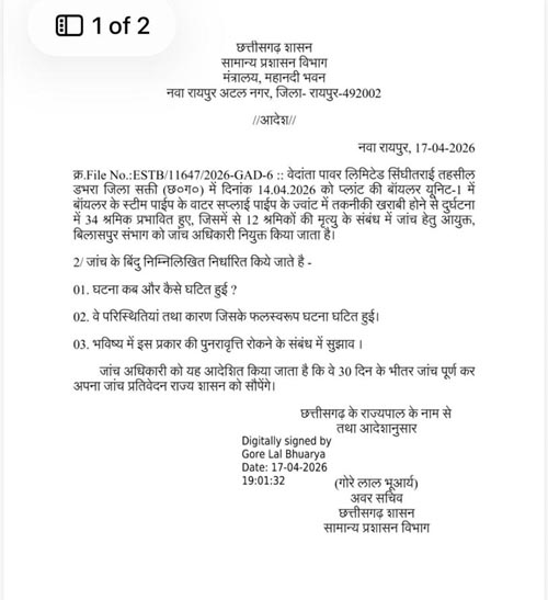 सक्ती, 18 अप्रैल (आरएनएस)। छत्तीसगढ़ के सक्ती जिले के सिंघीतराई स्थित वेदांता पावर प्लांट में हुए भीषण हादसे को लेकर सरकार ने सख्त रुख अपनाया है। राज्य शासन के सामान्य प्रशासन विभाग ने इस मामले में आयुक्त स्तर की जांच के आदेश जारी कर दिए हैं।