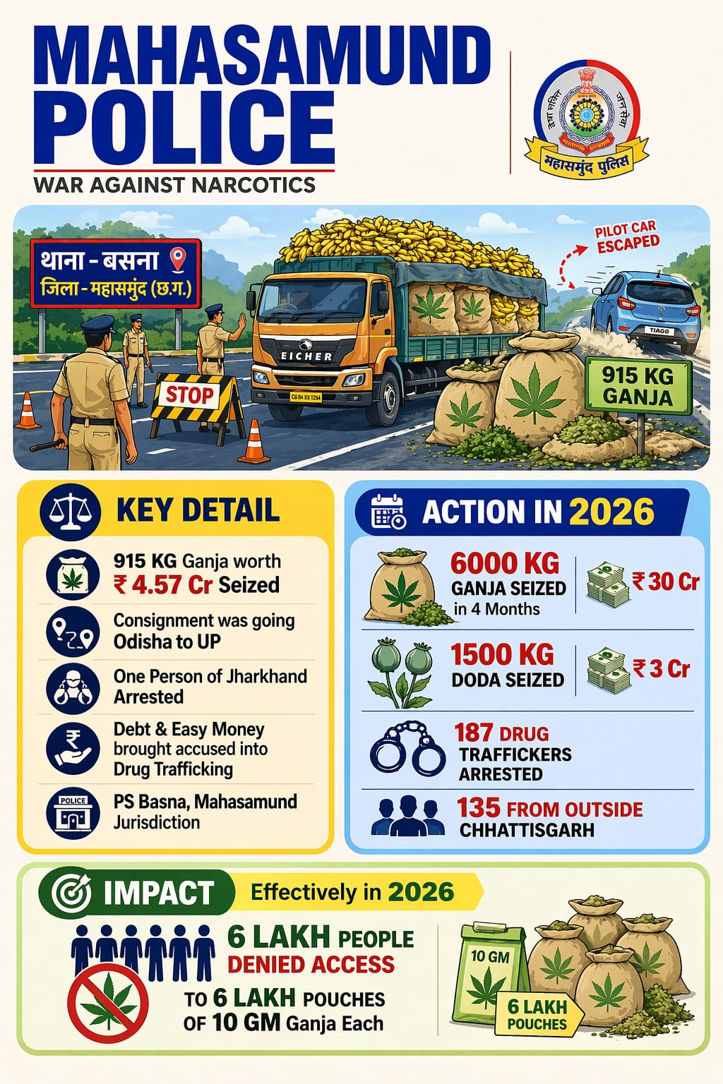 महासमुंद-बसना-18 अप्रैल (आरएनएस) केले की खेप के बीच छिपाकर करोड़ों का गांजा सप्लाई करने की साजिश पर महासमुंद पुलिस ने ऐसा वार किया कि तस्करों का पूरा खेल सड़क पर आ गया, ऑपरेशन निश्चय के तहत एंटी नारकोटिक टास्क फोर्स और थाना बसना पुलिस की संयुक्त टीम ने ओडिशा से उत्तरप्रदेश जा रही एक आईशर प्रो 2059 ट्रक को पलसापाली बैरियर के पास नाकाबंदी कर रोका और तलाशी में जो सामने आया उसने सबको चौंका दिया, ट्रक में ऊपर से केला लदा था लेकिन अंदर 29 बोरियों में छुपाकर 912.760 किलोग्राम गांजा भरकर तस्करी की जा रही थी जिसकी कीमत 4 करोड़ 56 लाख 38 हजार रुपये आंकी गई, पुलिस को पहले ही पुख्ता सूचना मिली थी कि एक संदिग्ध वाहन ओडिशा की ओर से आ रहा है, टीम ने मुस्तैदी दिखाते हुए घेराबंदी की और वाहन को रोका, पूछताछ में चालक की गतिविधियां संदिग्ध लगीं और जैसे ही बोरियों की जांच हुई पूरा राज खुल गया, तस्कर पुलिस को चकमा देने के लिए फर्जी नंबर प्लेट का भी इस्तेमाल कर रहे थे, मौके से दो मोबाइल और चार फर्जी नंबर प्लेट भी बरामद की गईं, कार्रवाई में कुल 4 करोड़ 66 लाख 45 हजार रुपये की संपत्ति जब्त की गई जिसमें गांजा, वाहन और अन्य सामग्री शामिल है, इस पूरे मामले में झारखंड के पूर्वी सिंहभूम जिला निवासी अब्दुल नईम पिता अब्दुल कलीम उम्र 42 वर्ष को गिरफ्तार किया गया है जो मानगो ओल्ड पुरुलिया रोड, केजीएन कॉलोनी जाकिर नगर का रहने वाला है, आरोपी के खिलाफ एनडीपीएस एक्ट की धारा 20(B)(ii)(C) के साथ-साथ बीएनएस की धारा 336(2), 338 और 340 के तहत मामला दर्ज कर लिया गया है और उसे न्यायिक रिमांड पर कोर्ट में पेश करने की प्रक्रिया जारी है, पुलिस जांच में यह भी स्पष्ट हुआ कि यह खेप ओडिशा से उठाकर उत्तरप्रदेश भेजी जा रही थी, महासमुंद पुलिस की लगातार सख्ती का अंदाजा इसी से लगाया जा सकता है कि पिछले तीन महीनों में 72 मामलों में 5629.602 किलो गांजा जब्त किया गया है और 187 आरोपियों को गिरफ्तार किया गया है जिनमें 135 अन्य राज्यों के हैं, यह कार्रवाई न सिर्फ एक बड़ी तस्करी को रोकने में सफल रही बल्कि यह भी साफ कर दिया कि अब हाईवे पर ‘फल की आड़ में जहर’ नहीं चलेगा, क्योंकि पुलिस की नजर हर उस बोरि पर है जिसमें कानून से बड़ा बनने की कोशिश की जाएगी।