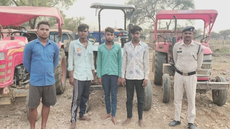 बलौदाबाजार-भाटापारा 18 अप्रैल (आरएनएस) लवन में अवैध रेत कारोबार पर पुलिस ने ऐसा ताबड़तोड़ वार किया कि मेन रोड पर ही खेल खत्म हो गया, 18 अप्रैल 2026 को थाना लवन पुलिस ने तुरमा घाट से चोरी की रेत लेकर निकल रहे ट्रैक्टर चालकों को घेराबंदी कर दबोच लिया और मौके से रेत से भरे 4 ट्रैक्टर-ट्रॉली समेत 4 आरोपियों को गिरफ्तार कर लिया, कार्रवाई पुलिस अधीक्षक भावना गुप्ता के निर्देशन में की गई जहां मुखबिर से मिली पुख्ता सूचना के बाद टीम ने लवन मेन रोड पर जाल बिछाया और जैसे ही रेत से लदे ट्रैक्टर पहुंचे, पुलिस ने चारों तरफ से घेरकर सभी को पकड़ लिया, पूछताछ में आरोपियों ने खुद कबूल किया कि वे तुरमा घाट से अवैध उत्खनन कर ट्रैक्टर के जरिए रेत का परिवहन कर रहे थे, पुलिस ने तुरंत कार्रवाई करते हुए सभी के खिलाफ थाना लवन में धारा 303(2), 3(5) बीएनएस के तहत अपराध दर्ज किया और उन्हें विधिवत गिरफ्तार कर न्यायालय में पेश करने की प्रक्रिया शुरू कर दी, पकड़े गए आरोपियों में इशू चेलक (20 वर्ष, ग्राम दतान ख, ट्रैक्टर CG 22AE 7868), गजेन्द्र धृतलहरे (18 वर्ष, ग्राम दतान ख, ट्रैक्टर CG22 T0587), संकेत कुमार साहू (22 वर्ष, ग्राम भरसेला, ट्रैक्टर CG 22 AD 3211) और नंद कुमार पटेल (26 वर्ष, ग्राम अमलडीहा, ट्रैक्टर CG22 AF 9545) शामिल हैं, पुलिस ने चारों ट्रैक्टर-ट्रॉली को जब्त कर लिया है और पूरे नेटवर्क की जांच में जुट गई है, इस कार्रवाई से साफ संदेश है कि अब रेत माफिया की मनमानी नहीं चलेगी और कानून की पकड़ से बचना नामुमकिन है।