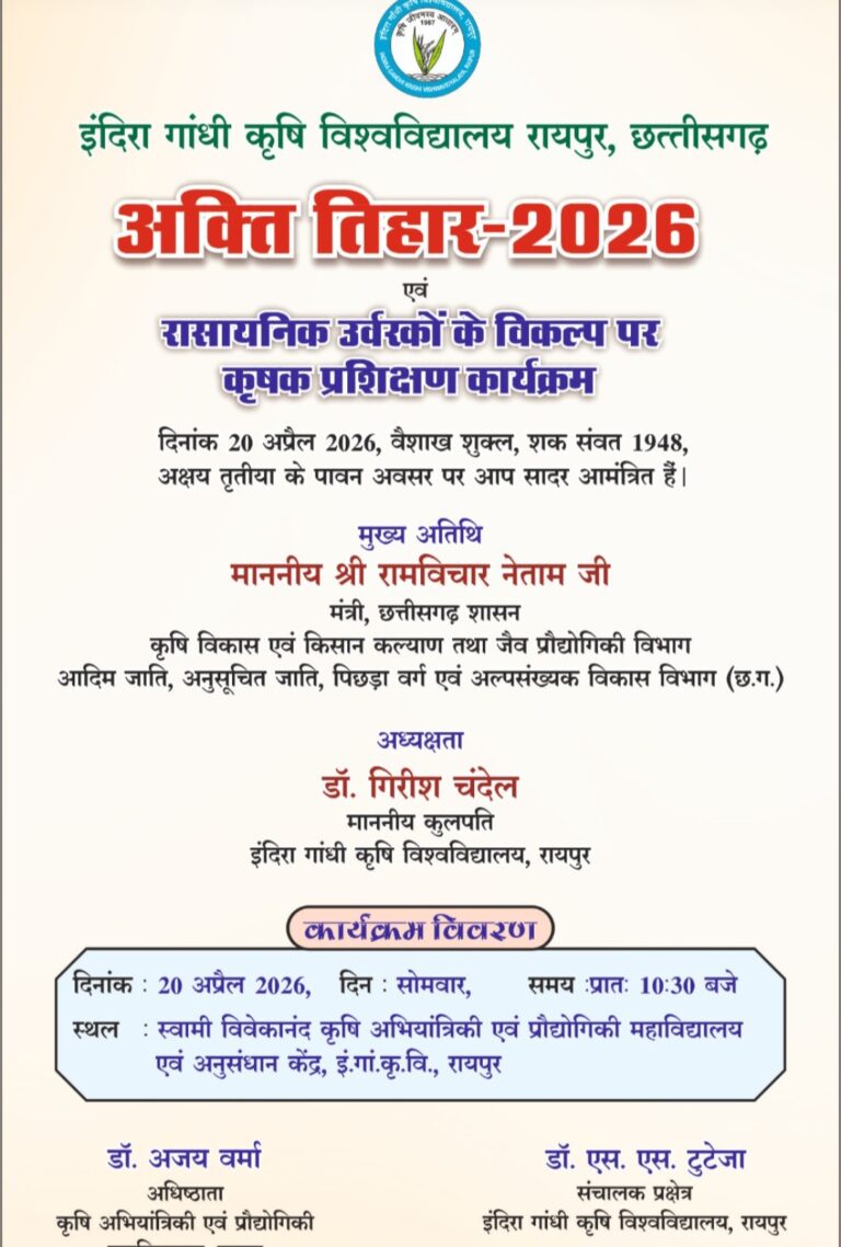 रायपुर,19 अप्रैल (आरएनएस)। इंदिरा गांधी कृषि विश्वविद्यालय में अक्षय तृतीया के अवसर पर कल ”अक्ती तिहारÓÓ का आयोजन किया जा रहा है। स्वामी विवेकानंद कृषि अभियांत्रिकी महाविद्यालय एवं अनुसंधान केन्द्र के पास स्थित प्रक्षेत्र में प्रात: 10:30 बजे से आयोजित राज्य स्तरीय अक्ती तिहार समारोह के मुख्य अतिथि कृषि मंत्री रामविचार नेताम होंगे। समारोह की अध्यक्षता इंदिरा गांधी कृषि विश्वविद्यालय के कुलपति डॉ. गिरीश चंदेल करेंगे। अक्षय तृतीया के अवसर पर धरती माता एवं बीजों की पूजा-अर्चना कर बीज बुआई का कार्य प्रतीकात्मक रूप से किया जाएगा। कृषि मंत्री नेताम द्वारा प्रगतिशील कृषकों को कृषि आदान सामग्री का वितरण किया जाएगा। इस अवसर पर किसानों के लिए नवीन बीज बुआई तकनीकी एवं कृषि में ड्रोन का उपयोग तकनीक का प्रदर्शन भी किया जाएगा। कृषि विज्ञान केंन्द्र रायपुर द्वारा इस अवसर पर रासायनिक उर्वरकों का विकल्प विषय पर कृषक प्रशिक्षण कार्यक्रम का आयोजन भी किया गया है। अक्ती तिहार का आयोजन इंदिरा गांधी कृषि विश्वविद्यालय के अंतर्गत संचालित समस्त महाविद्यालयों, कृषि विज्ञान केन्द्रां एवं अनुसंधान केन्द्रों में भी किया जाएगा। उल्लेखनीय है कि अक्ती तिहार छत्तीसगढ़ की समृद्ध लोक परंपराओं और कृषि संस्कृति का एक महत्वपूर्ण पर्व है जो अक्षय तृतीया के शुभ दिन मनाया जाता है। यह त्यौहार केवल एक धार्मिक अनुष्ठान नहीं बल्कि हमारे कृषक जीवन की नई शुरूआत का प्रतीक है। इस दिन से खेती के नए कार्यों का शुभारंभ होता है। यह पर्व हमें प्रकृति के प्रति कृतज्ञता व्यक्त करने और अच्छी फसल की कामना करने का अवसर प्रदान करता है। अक्ती तिहार के अवसर पर गांवों में सभी देवी-देवताओं की पूजा-अर्चना की जाती है। ग्राम बैगा द्वारा ठाकुर देव की पूजा कर धान चढ़ाया जाता है जो हमारी पारंपरिक आस्था और प्रकृति से जुड़ाव को दर्शाता है। किसान भाई अपने घरों से धान लाकर उसका एक भाग अपनी कोठी में मिलाते हैं और शेष भाग खेतों में पूजन के साथ बुआई की शुरूआत के रूप में अर्पित करते हैं। यह परंपरा कृषि कार्य की शुभ शुरूआत का संकेत देती है।