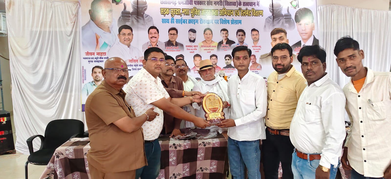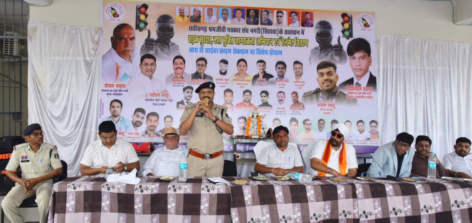 नगरी 20 अप्रैल (आरएनएस) हेलमेट पहनने की शपथ, नशे से दूरी का संकल्प और साइबर ठगी से बचने का संदेश—नगरी में 150 हेलमेट बांटकर छत्तीसगढ़ श्रमजीवी पत्रकार संघ ने सड़क सुरक्षा को लेकर ऐसा अभियान छेड़ा जिसने प्रशासन, जनप्रतिनिधियों और आम लोगों को एक मंच पर खड़ा कर दिया और साफ संदेश दिया कि अब लापरवाही नहीं, सुरक्षा ही प्राथमिकता है। 18 अप्रैल शनिवार दोपहर 3 बजे नगरी के आत्मानंद स्कूल परिसर में छत्तीसगढ़ श्रमजीवी पत्रकार संघ नगरी सिहावा के बैनर तले सड़क सुरक्षा, नशा मुक्ति और साइबर जागरूकता को लेकर व्यापक जन-जागरूकता अभियान के साथ 150 निशुल्क हेलमेट वितरण कार्यक्रम का आयोजन किया गया, जो प्रदेश अध्यक्ष अरविंद अवस्थी के नेतृत्व और मार्गदर्शन में सम्पन्न हुआ, कार्यक्रम में जिला पंचायत धमतरी अध्यक्ष अरुण सार्वा मुख्य अतिथि के रूप में शामिल हुए जबकि नगर पंचायत नगरी अध्यक्ष बलजीत छाबड़ा ने अध्यक्षता की और नगर उपाध्यक्ष विकास बोहरा विशिष्ट अतिथि के रूप में मौजूद रहे, वहीं एसडीओपी विपिन रंगारी, वरिष्ठ पत्रकार जीवन नाहटा, जिला संरक्षक किशन मगेन्द्र, ब्लॉक सरपंच संघ अध्यक्ष उमेश देव, कमल डागा सहित पत्रकार, जनप्रतिनिधि और बड़ी संख्या में नागरिक कार्यक्रम में शामिल हुए, कार्यक्रम के दौरान हेलमेट वितरण के साथ सड़क दुर्घटनाओं को रोकने, युवाओं को नशे से दूर रखने और साइबर अपराध से बचाव को लेकर विस्तार से जागरूक किया गया, मुख्य अतिथि अरुण सार्वा ने कहा कि आज के समय में सड़क सुरक्षा, नशा मुक्ति और साइबर जागरूकता समाज की सबसे बड़ी जरूरत बन चुकी है और सावधानीपूर्वक वाहन चलाना हर नागरिक की जिम्मेदारी है, नगर पंचायत अध्यक्ष बलजीत छाबड़ा ने दोपहिया चालकों से हेलमेट पहनने और यातायात नियमों का पालन करने की अपील की और चेताया कि छोटी लापरवाही भी बड़ी दुर्घटना बन सकती है, इस दौरान एसडीओपी विपिन रंगारी ने उपस्थित लोगों को सड़क सुरक्षा नियमों के पालन की शपथ दिलाई और कहा कि हेलमेट केवल नियम नहीं बल्कि जीवन बचाने का सबसे मजबूत सुरक्षा कवच है, उन्होंने युवाओं को नशे से दूर रहने और शिक्षा, खेल व सकारात्मक गतिविधियों की ओर बढ़ने की सलाह दी, साथ ही साइबर अपराधों को लेकर लोगों को चेताते हुए अनजान कॉल, लिंक और ओटीपी साझा नहीं करने की अपील की और ठगी होने पर तुरंत संबंधित विभाग को सूचना देने को कहा, कार्यक्रम में वक्ताओं ने सड़क दुर्घटनाओं के कारणों जैसे तेज रफ्तार, नशे में वाहन चलाना और नियमों की अनदेखी को लेकर चिंता जताई और दुर्घटना पीड़ितों की मदद करने वालों को शासन द्वारा सहयोग राशि मिलने की जानकारी भी दी, कार्यक्रम को सफल बनाने में डीगेश साहू, रौनक नाहटा, रजक नाहटा, अनिल वाधवानी, ऑटो संघ, पटेल ऑटो, मंशाराम साहू, रा