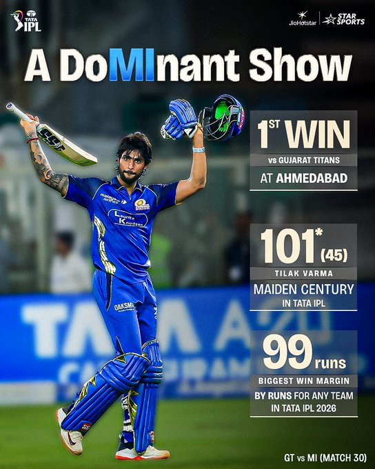 अहमदाबाद, 21 अपै्रल। मुंबई इंडियंस ने आईपीएल 2026 के 30वें मैच में गुजरात टाइटंस को उनके घर पर 99 रनों से मात देकर बड़ी जीत दर्ज करने में सफल रही. जिसकी वजह से वो अंक तालिका में 10वें नंबर से उठकर 7वें नंबर पर पहुंच गए.