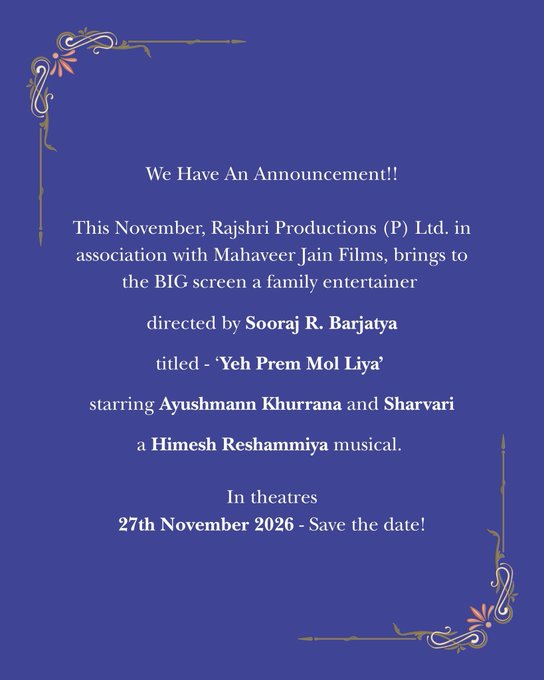 राजश्री ने अपने नोट में लिखा है, हमारे पास एक अनाउंसमेंट है. इस नवंबर, राजश्री प्रोडक्शंस लिमिटेड, महावीर जैन फिल्म्स के सहयोग से, बड़े पर्दे पर एक फैमिली एंटरटेनर फिल्म लेकर आ रहा है. सूरज आर. बडज़ात्या की निर्देशित इस फिल्म का टाइटल है – ये प्रेम मोल लिया. इसमें आयुष्मान खुराना और शरवरी मुख्य भूमिका में हैं. यह हिमेश रेशमिया का एक म्यूजिकल है. थिएटर में 27 नवंबर 2026 को. तारीख याद रखें.