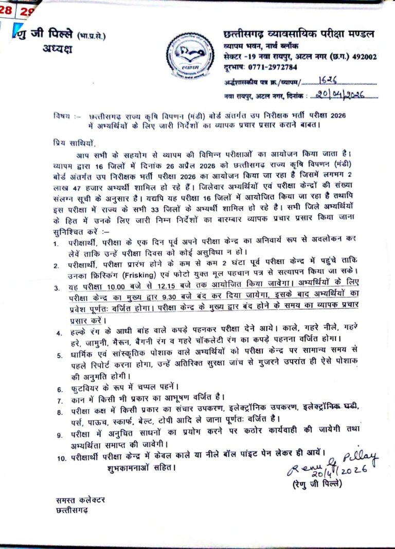 जशपुरनगर,22 अप्रैल (आरएनएस)। छत्तीसगढ़ व्यावसायिक परीक्षा मंडल (व्यापम) द्वारा आगामी 26 अप्रैल 2026 को छत्तीसगढ़ राज्य कृषि विपणन (मंडी) बोर्ड के अंतर्गत उप निरीक्षक भर्ती परीक्षा 2026 का आयोजन किया जाएगा। यह परीक्षा राज्य के 16 जिलों में आयोजित की जा रही है। जिसमें लगभग 2 लाख 47 हजार अभ्यर्थी शामिल होंगे। जिसमें प्रदेश के 33 जिलों के अभ्यर्थी शामिल होंगे। जशपुर जिले में कुल 15 परीक्षा केन्द्रों में परीक्षा सम्पन्न होगी, जिसमें 4904 परीक्षार्थी सम्मिलित होगें। परीक्षा के सुचारू संचालन हेतु डिप्टी कलेक्टर श्री समीर बड़ा को नोडल अधिकारी नियुक्त किया गया है। प्राप्त जानकारी के अनुसार संबंधित परीक्षार्थियों को परीक्षा के एक दिन पूर्व अपने परीक्षा केंद्र का अनिवार्य रूप से अवलोकन करें। ताकि परीक्षा दिवस पर किसी प्रकार की असुविधा का सामना न करना पड़े। साथ ही अभ्यर्थियों को परीक्षा प्रारंभ होने से कम से कम दो घंटे पूर्व परीक्षा केंद्र में पहुंचने के निर्देश दिए गए हैं। जिससे उनकी फ्रिस्किंग एवं फोटो युक्त मूल पहचान पत्र के माध्यम से सत्यापन की प्रक्रिया समय पर पूर्ण की जा सके। परीक्षा का समय प्रात: 10 बजे से दोपहर 12:15 बजे तक आयोजित किया जाएगा। परीक्षा केंद्रों के मुख्य द्वार सुबह 9:30 बजे बंद कर दिए जाएंगे, जिसके पश्चात किसी भी अभ्यर्थी को प्रवेश की अनुमति नहीं दी जाएगी। परीक्षार्थियों को हल्के रंग के आधी बांह वाले कपड़े पहनकर परीक्षा देने आने के लिए कहा गया है। काले, गहरे नीले, गहरे हरे, जामुनी, मैरून, बैंगनी तथा गहरे चॉकलेटी रंग के कपड़े पहनना पूर्णत: वर्जित रहेगा। धार्मिक एवं सांस्कृतिक पोशाक पहनने वाले अभ्यर्थियों को सामान्य समय से पहले परीक्षा केंद्र पर पहुंचना होगा, जहां अतिरिक्त सुरक्षा जांच के उपरांत ही उन्हें ऐसी पोशाक में प्रवेश की अनुमति दी जाएगी। अभ्यर्थी परीक्षा केंद्र में फुटवियर के रूप में केवल चप्पल पहनकर ही आएं। कान में किसी भी प्रकार के आभूषण पहनना वर्जित रहेगा। परीक्षा कक्ष में किसी भी प्रकार के संचार उपकरण, इलेक्ट्रॉनिक उपकरण, इलेक्ट्रॉनिक घड़ी, पर्स, पाउच, स्कार्फ, बेल्ट एवं टोपी आदि ले जाना पूरी तरह प्रतिबंधित किया गया है। यदि कोई अभ्यर्थी परीक्षा के दौरान अनुचित साधनों का प्रयोग करता पाया जाता है, तो उसके विरुद्ध कठोर कार्रवाई की जाएगी तथा उसकी अभ्यर्थिता समाप्त कर दी जाएगी। अभ्यर्थियों को केवल काले या नीले बॉल प्वाइंट पेन के साथ ही परीक्षा केंद्र में प्रवेश की अनुमति होगी।
