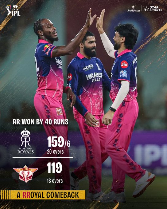 नईदिल्ली, 23 अपै्रल। इंडियन प्रीमियर लीग 2026 के 32वें मैच में राजस्थान रॉयल्स ने लखनऊ सुपर जायंट्स पर शानदार जीत दर्ज की. लखनऊ सुपर जायंट्स को अपने होम ग्राउंड पर 40 रनों से हार का सामना करना पड़ा. ये लखनऊ की अपने होम ग्राउंड पर इस सीजन की लगातार तीसरी हार है.