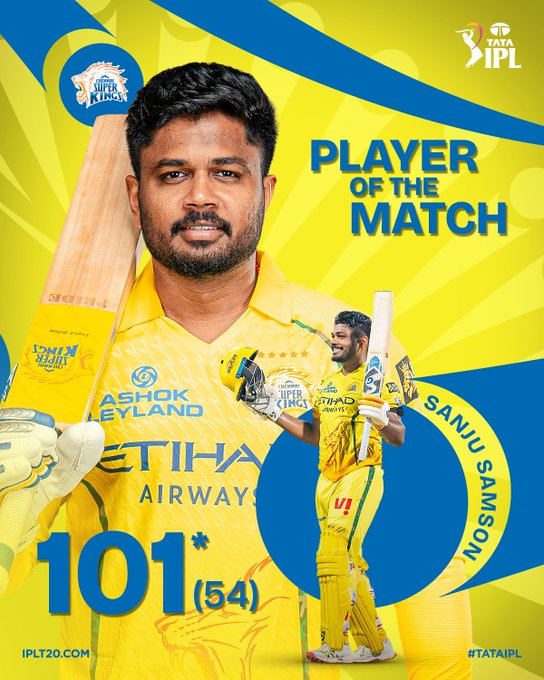 चेन्नई सुपरकिंग्स के लिए सैमसन सलामी बल्लेबाज के रूप में आए थे। पहले विकेट के लिए उन्होंने रुतुराज गायकवाड़ के साथ 18 गेंदों में 32 रन जोड़े। इसके बाद सरफराज खान के साथ 16 गेंदों में 40 रन की साझेदारी निभाई। डेवाल्ड ब्रेविस के साथ उन्होंने 31 रन और कार्तिक शर्मा के साथ 43 रन जोड़े। उन्होंने 54 गेंदों का सामना कर 101* रन बनाए। उनके बल्ले से 10 चौके और 6 छक्के निकले। उनकी स्ट्राइक रेट 187.04 की रही।