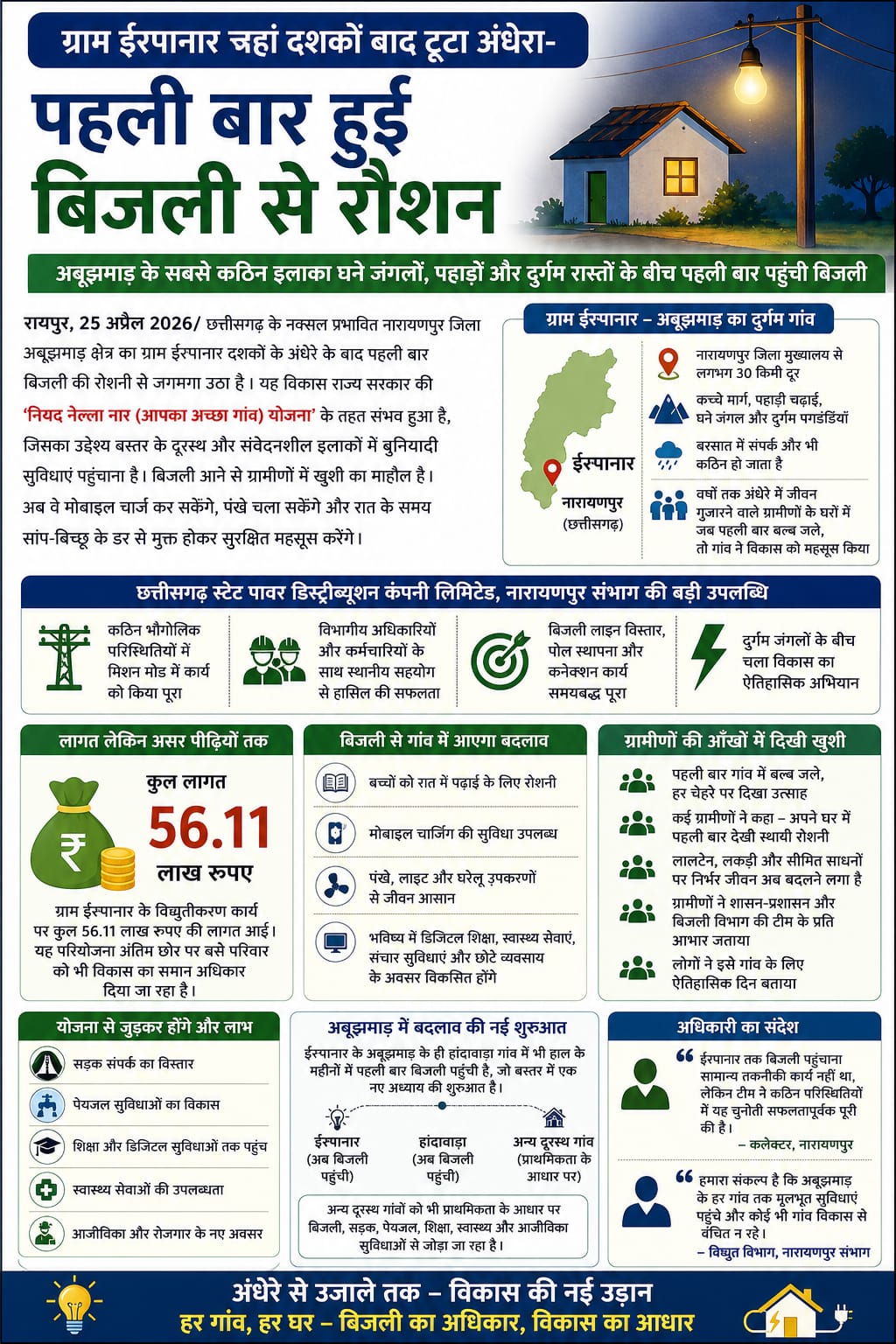 रायपुर, 25 अप्रैल 2026 /(आरएनएस) नक्सल समस्या के दूर होने के साथ बस्तर क्षेत्र में ऐतिहासिक बदलाव देखने को मिल रहा है। पहली बार दूरस्थ गांवों तक बिजली पहुँचने से अंधकार और भय कम हुआ है, जीवन स्तर में सुधार आया है और विकास को नई गति मिली है, जो बस्तर के सुरक्षित और समृद्ध भविष्य की ओर संकेत करता है। छत्तीसगढ़ के नक्सल प्रभावित नारायणपुर जिला का अबूझमाड़ क्षेत्र का ग्राम ईरपानार दशकों के अंधेरे के बाद पहली बार बिजली की रौशनी से जगमगा उठा है। यह विकास राज्य सरकार की नियद नेल्ला नार (आपका अच्छा गांव) योजना के तहत संभव हुआ है, जिसका उद्देश्य बस्तर के दूरस्थ और संवेदनशील इलाकों में बुनियादी सुविधाएं पहुंचाना है। बिजली आने से ग्रामीणों में खुशी का माहौल है। अब वे मोबाइल चार्ज कर सकेंगे, पंखे चला सकेंगे और रात के समय सांप-बिच्छू के डर से मुक्त होकर सुरक्षित महसूस करेंगे।