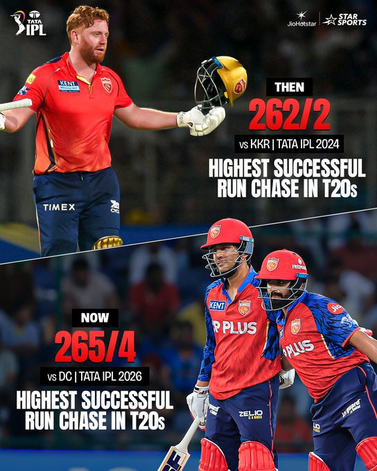 नईदिल्ली, 26 अपै्रल। इंडियन प्रीमियर लीग 2026 में पंजाब किंग्स ने दिल्ली कैपिटल्स के खिलाफ टूर्नामेंट के इतिहास का सबसे बड़ा स्कोर (265 रन) चेज करके नया कीर्तिमान स्थापित कर दिया है. इसके अलावा ये टी20 इतिहास का सबसे बड़ा सफल चेज भी बन गया है.