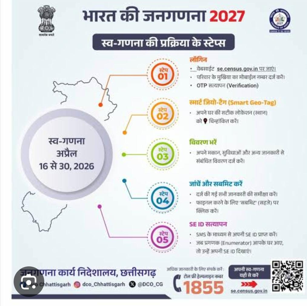 सुकमा,26 अप्रैल (आरएनएस)। भारत की जनगणना 2027 कार्यक्रम शुरू हो गया है। यह 15 साल बाद हो रहा है। जो परिवार पलायन किये, नौकरीपेशा, 1 से 30 मई तक घर से बाहर रहने वाले हैं या घर से बाहर रहते हैं उन लोगों के लिए खुशखबरी की बात है। उन्हें जनगणना के लिए घर आने की जरूरत नहीं है, वे जहां है वहीं से जनगणना के फॉर्म को स्वगणना का ऑनलाइन फॉर्म 30 अप्रैल 2026 तक वेबसाईट (एसई डॉट सेंसस डॉट जीओव्ही डॉट इन) पर स्वयं भर सकते हैं, जिसके बाद उन्हें एक विशेष आईडी प्राप्त होगी। गणना कर्मी (प्रगणक) के घर पहुंचने पर यह आईडी दिखाने से पूरी प्रक्रिया कुछ ही मिनटों में पूरी हो जाएगी। इसके लिए प्रगणक से संपर्क करना चाहिए। डिजिटल प्रक्रिया के तहत पलायन किये या मई में घर पर नहीं रहने वालों को इसका उपयोग किया जाना चाहिए ताकि वे जनगणना से वंचित नहीं हो। जनगणना में जो स्वगणना नहीं किये उनके लिए घर घर जाकर मकान सूचीकरण होगा, जो 1 मई से 30 मई 2026 तक चलेगा। इसके तहत लगभग 33 प्रश्न पूछे जाएंगे, जिनमें घर की स्थिति, पेयजल, बिजली, शौचालय और अन्य सुविधाओं की जानकारी शामिल होगी। मुख्य जनगणना फरवरी 2027 से शुरू होकर मार्च 2027 तक पूरी की जाएगी। नागरिकों की सामाजिक आर्थिक स्थिति का आंकलन किया जाएगा।स्व-गणना सिर्फ सुविधा है, मजबूरी नहीं। अगर आप ऑनलाइन नहीं भर पाते तो जनगणनाकर्मी पहले की तरह घर आकर फॉर्म भरेंगे।