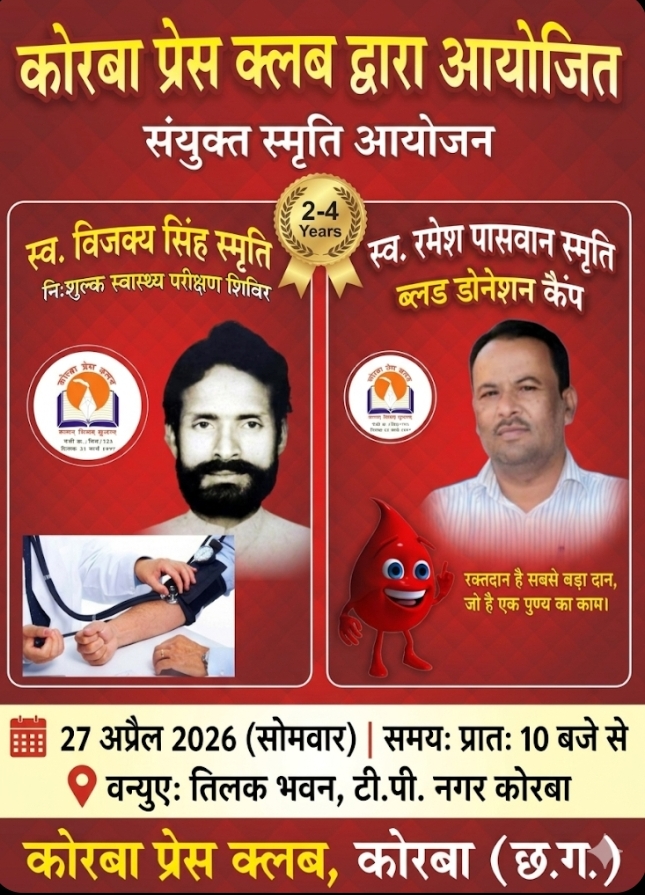 कोरबा 27 अपै्रल (आरएनएस)। पत्रकारिता जगत की दो प्रमुख विभूतियों, स्व. रमेश पासवान और स्व. विजय सिंह की यादों को संजोते हुए कोरबा प्रेस क्लब सेवा की अलग मिसाल पेश करेगा। आज सोमवार, 27 अप्रैल को टीपी नगर स्थित तिलक भवन में विशाल स्वास्थ्य और रक्तदान शिविर का आयोजन किया जा रहा है। सुबह 10 बजे से शुरू होने वाले इस शिविर में मेडिकल कॉलेज के विशेषज्ञ डॉक्टर अपनी सेवाएँ देंगे। प्रेस क्लब ने सभी से इस ‘महादानÓ का हिस्सा बनने की अपील की है।