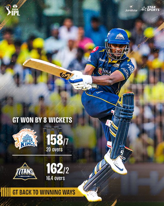 नईदिल्ली, 27 अपै्रल। इंडियन प्रीमियर लीग 2026 के 37वें मैच में गुजरात टाइटंस ने चेन्नई सुपर किंग्स को 8 विकेट मात दे दी. एम चिदंबरम स्टेडियम में खेले गए मैच में गुजरात ने 159 रनों के लक्ष्य को साई सुदर्शन की 87 रनों की पारी की बदौलत 16.4 ओवर में दो विकेट के नुकसान पर ही आसानी से हासिल कर लिया. इस जीत के साथ गुजरात अंक तालिका में 8 पॉइंट्स के साथ पांचवें नंबर पर पहुंच गया है और चेन्नई सुपर किंग्स एक स्थान नीचे खिसक कर छठे स्थान पर चला गया.