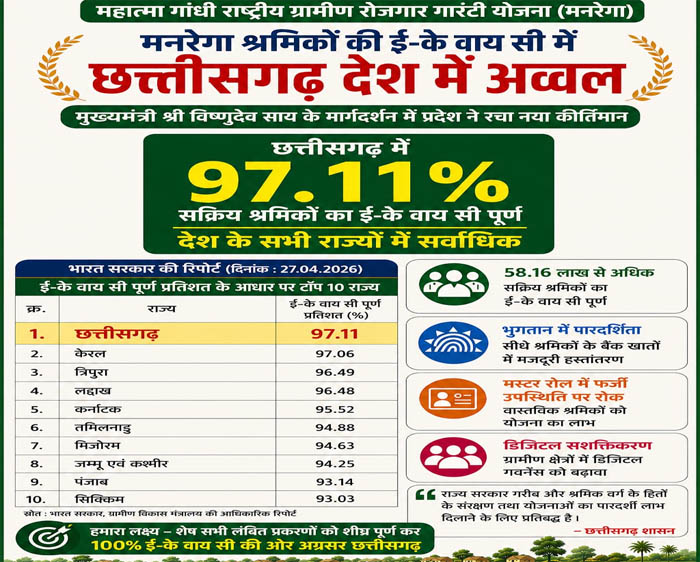 महात्मा गांधी राष्ट्रीय ग्रामीण रोजगार गारंटी योजना मनरेगा के तहत श्रमिकों की ई-केवाईसी (e-KYC) प्रक्रिया को पूरा करने में छत्तीसगढ़ ने देश भर में अग्रणी स्थान हासिल किया है। प्रदेश में लगभग 58.16 लाख से ज्यादा मजदूरों की डिजिटल वेरिफिकेशन (e-KYC) पूरी की गई हैए जो भुगतान में पारदर्शिता सुनिश्चित करती है। यह डिजिटल प्रक्रिया फर्जी जॉब कार्डों को हटाने और सीधे वास्तविक लाभार्थियों के बैंक खातों में मजदूरी पहुंचाने में मदद कर रही है।