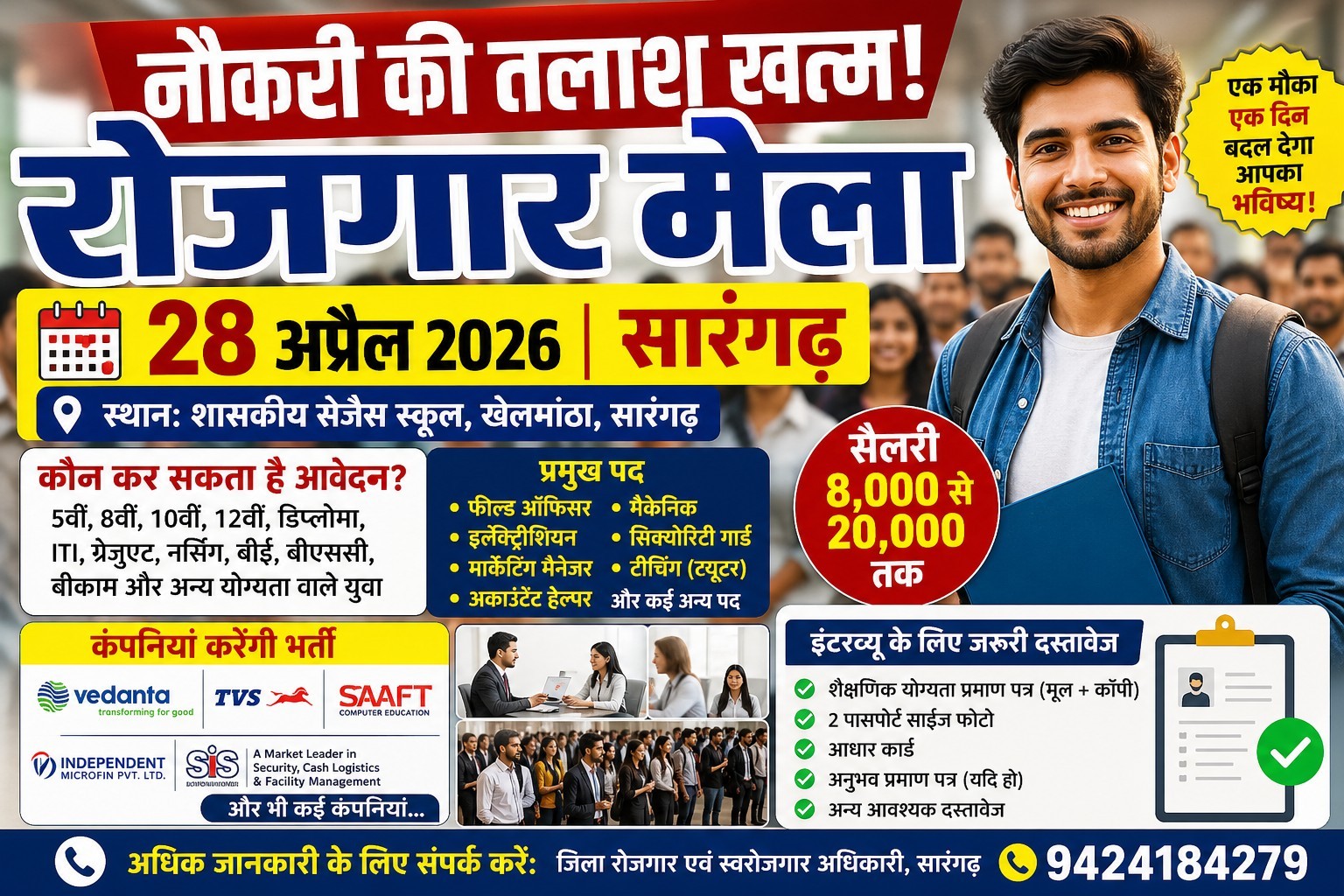 सारंगढ़ बिलाईगढ़, 27 अप्रैल 2026 (आरएनएस) कौशल विकास, तकनीकी शिक्षा एवं रोजगार विभाग द्वारा 28 अप्रैल को शासकीय सेजेस स्कूल खेलभांठा सारंगढ़ में जिला स्तरीय रोजगार मेला का आयोजन किया जा रहा है। रोजगार मेला में निजी क्षेत्र के तकनीकी एवं गैर तकनीकी के पदों पर चयन हेतु साक्षात्कार लिया जाएगा। इस रोजगार मेला में शामिल होने के लिए ऑनलाईन पोर्टल ईरोजगार डॉट सीजी डॉट जीओवी डॉट इन www.erojgar.cg.gov.in में रोजगार पंजीयन एवं रोजगार मेला के लिए पंजीयन आवश्यक है। जिन आवेदकों ने ऑनलाईन पोर्टल में रोजगार पंजीयन एवं रोजगार मेला हेतु पंजीयन नहीं किया है, सारंगढ़ बिलाईगढ़ जिले के आवेदकों का इंटरव्यू लिया जाएगा। वह पोर्टल पर अपना पंजीयन कर सकते हैं। रोजगार मेला में साक्षात्कार के लिए शामिल होने वाले अभ्यर्थियों को समस्त शैक्षणिक योग्यता प्रमाण पत्र की ओरिजिनल और फोटोकॉपी , 2 पासपोर्ट साईज फोटो, आधार कार्ड, अनुभव प्रमाण पत्र सहित अन्य दस्तावेज को साथ लाना होगा। इस संंबंध में विस्तृत जानकारी जिला रोजगार एवं स्वरोजगार अधिकारी रामजीत राम से मोबाइल नंबर 9424184279 से प्राप्त की जा सकती है।