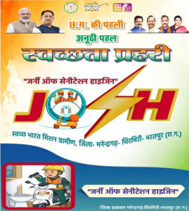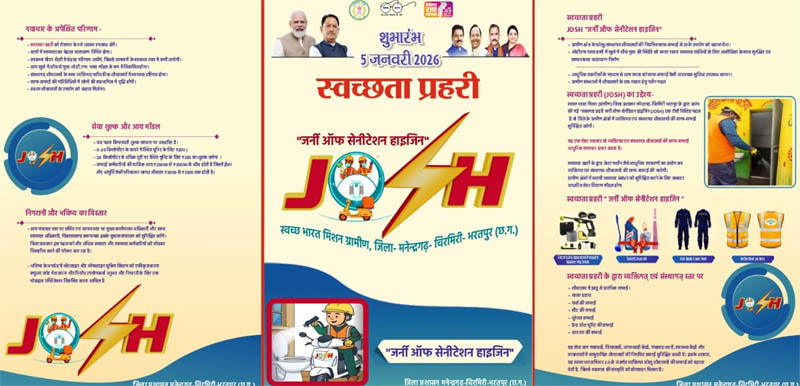 विदित हो कि 5 जनवरी 2026 को खडग़वां से जिले के प्रभारी मंत्री रामविचार नेताम एवं स्वास्थ्य मंत्री श्याम बिहारी जायसवाल द्वारा जर्नी ऑफ सैनिटेशन हाइजीन (JOSH )” का शुभारंभ किया गया था। कलेक्टर डी. राहुल वेंकट के मार्गदर्शन में जिले के तीनों जनपद पंचायतों में संस्थागत, व्यावसायिक एवं व्यक्तिगत शौचालयों की नियमित साफ-सफाई, उपयोग बढ़ाने तथा युवाओं को स्वरोजगार से जोडऩे के उद्देश्य से इसकी रूपरेखा तैयार की गई।