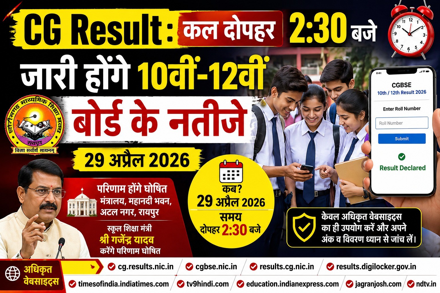 रायपुर, 28 अप्रैल 2026 (आरएनएस) — छत्तीसगढ़ माध्यमिक शिक्षा मंडल (CGBSE) द्वारा आयोजित हाईस्कूल (10वीं) और हायर सेकेंडरी (12वीं) परीक्षा 2026 के परिणाम 29 अप्रैल को दोपहर 2:30 बजे जारी किए जाएंगे।