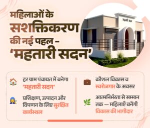 महतारी सदन योजना छत्तीसगढ़ सरकार की एक महत्वाकांक्षी पहल है, जिसका उद्देश्य महिलाओं को आत्मनिर्भर बनाने के साथ-साथ उन्हें योजनाओं से सीधे जोडऩा है। इस योजना के अंतर्गत प्रत्येक ग्राम पंचायत में महतारी सदन का निर्माण किया जाएगा। ये सदन महिला स्व सहायता समूहों के लिए एक सशक्त कार्यालय, प्रशिक्षण केंद्र और कार्यस्थल के रूप में कार्य करेंगे, जहाँ महिलाएँ सामूहिक रूप से अपने आर्थिक और सामाजिक विकास के कार्य संचालित कर सकेंगी।