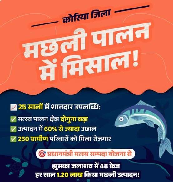 प्रधानमंत्री मत्स्य सम्पदा योजना के अंतर्गत जिले के झुमका सिंचाई जलाशय में 48 केजों की स्थापना की गई है, जिनमें पंगास मछली का पालन किया जा रहा है। प्रत्येक केज से औसतन 2500 किलोग्राम मछली उत्पादन प्राप्त हो रहा है। इस प्रकार जिले में 1 लाख 20 हजार किलोग्राम वार्षिक उत्पादन दर्ज किया गया है, जिससे मत्स्य पालक परिवारों को स्थायी आमदनी प्राप्त हो रही है।