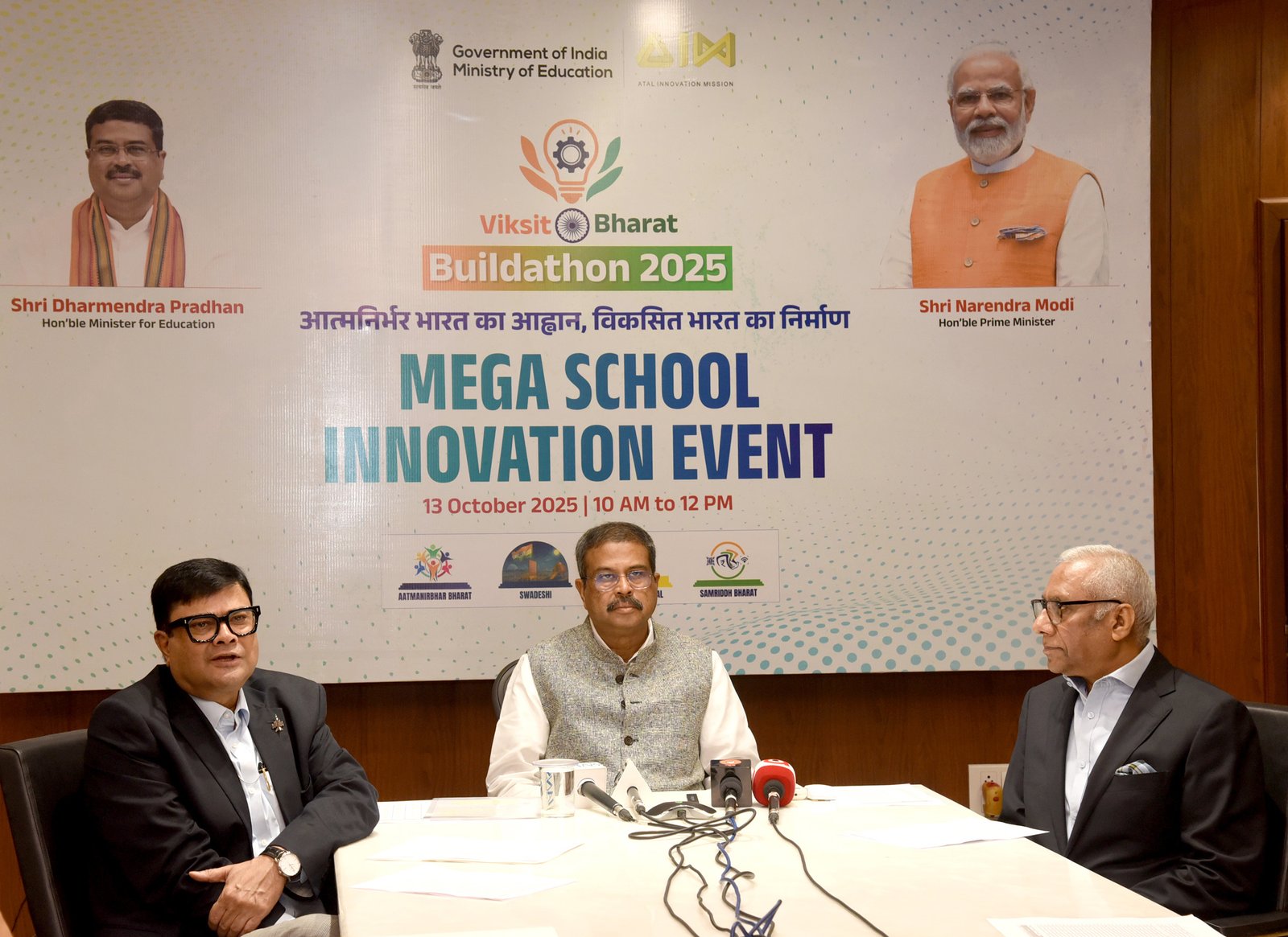 (13कैप्शन11)केंद्रीय शिक्षा मंत्री, धर्मेंद्र प्रधान ने नई दिल्ली में विकसित भारत बिल्डथॉन-2025 के तहत देश भर के स्कूलों में लाइव-सिंक्रोनाइज़्ड टिंकरिंग गतिविधि की शुरुआत के लिए मेगा स्कूल इनोवेशन इवेंट पर आयोजित एक बैठक की अध्यक्षता की।