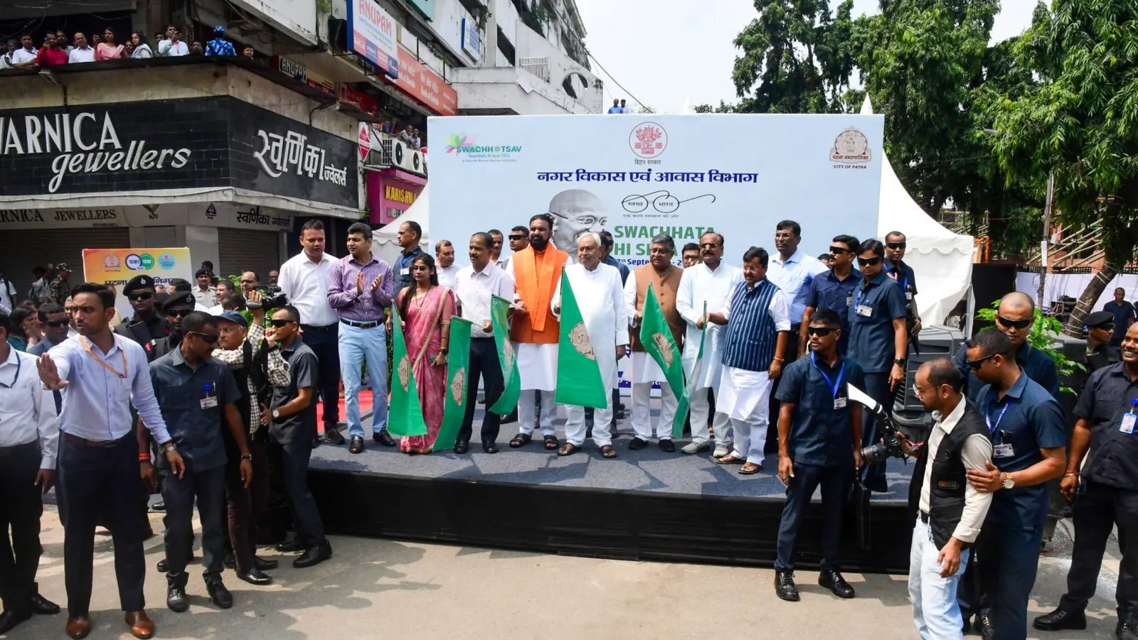 बिहार के मुख्यमंत्री नीतीश कुमार, राज्य के उपमुख्यमंत्री सम्राट चौधरी और भाजपा सांसद रविशंकर प्रसाद के साथ पटना में शहरी विकास और आवास विभाग की कई परियोजनाओं के उद्घाटन और शिलान्यास के दौरान वाहनों को हरी झंडी दिखाते हुए।