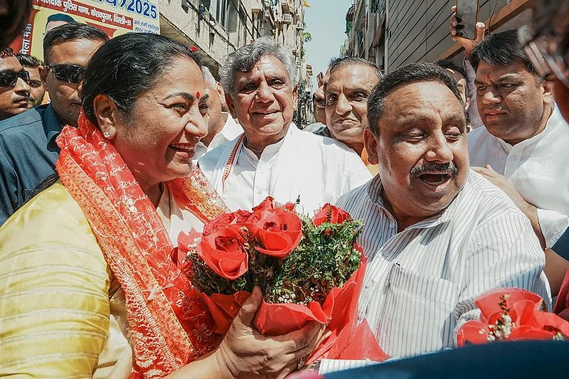 दिल्ली की मुख्यमंत्री रेखा गुप्ता का दिल्ली के त्रिनगर स्थित तोताराम बाजार में व्यापारियों से मिलने पहुंचने पर फूलों से स्वागत किया गया।