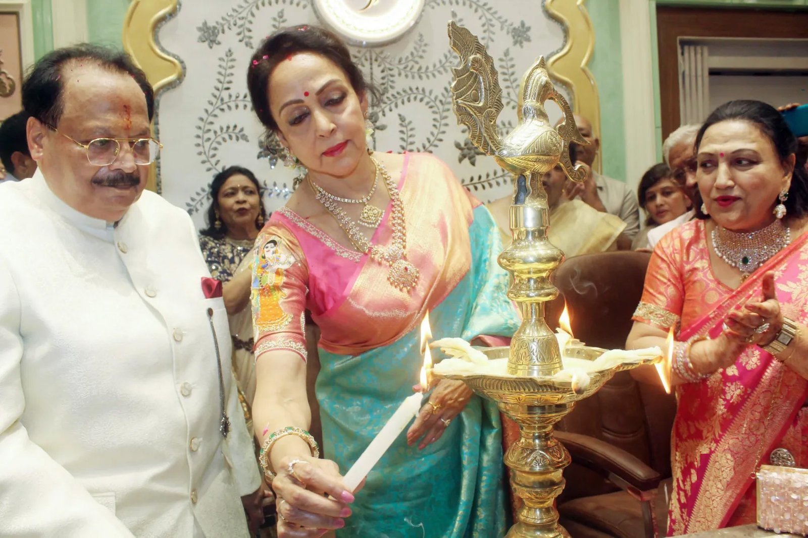 भाजपा सांसद और अभिनेत्री हेमा मालिनी मेरठ में एक आभूषण शोरूम के उद्घाटन के दौरान दीप प्रज्वलित करती हुई।