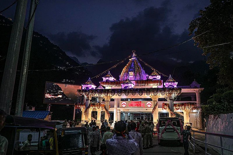 जम्मू-कश्मीर के रियासी जिले के कटरा में नवरात्रि उत्सव के पहले दिन माता वैष्णो देवी मंदिर के लिए रवाना होने की तैयारी करते तीर्थयात्री दर्शनी ड्योढ़ी पर पहुंचते हुए ।