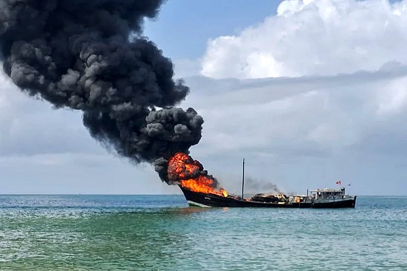 गुजरात के पोरबंदर में पोरबंदर जेट्टी पर सोमालिया के लिए चावल और चीनी लादते समय एचआरएम एंड संस-पंजीकृत मालवाहक जहाज से धुआँ निकलता हुआ। अधिकारियों ने किसी हताहत की पुष्टि नहीं की है।