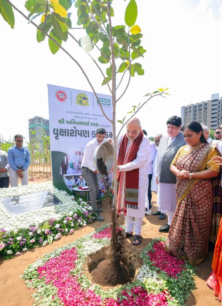 केंद्रीय गृह मंत्री अमित शाह गांधीनगर में ‘एक पेड़ मां के नाम’ पहल के तहत एक पौधा लगाते हुए।