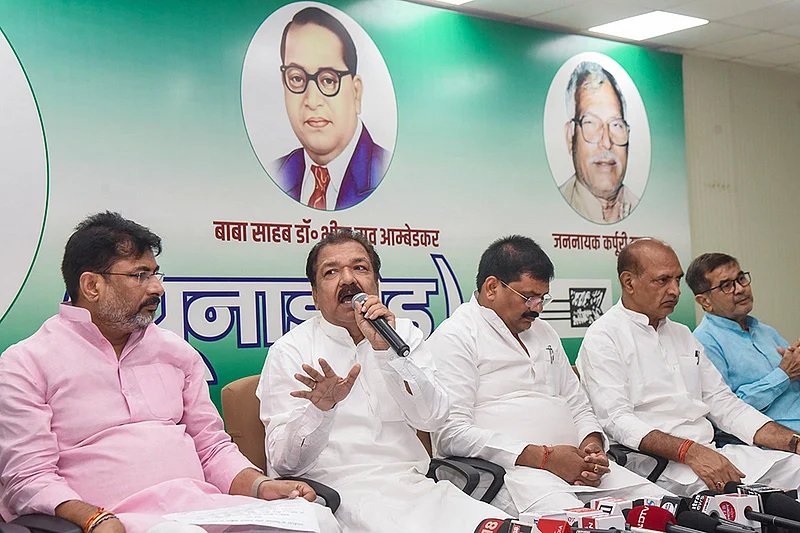 पटना में एनडीए की प्रेस कॉन्फ्रेंस के दौरान बिहार भाजपा अध्यक्ष दिलीप जायसवाल, जनता दल (यूनाइटेड) के प्रदेश अध्यक्ष उमेश सिंह कुशवाहा और अन्य के साथ।