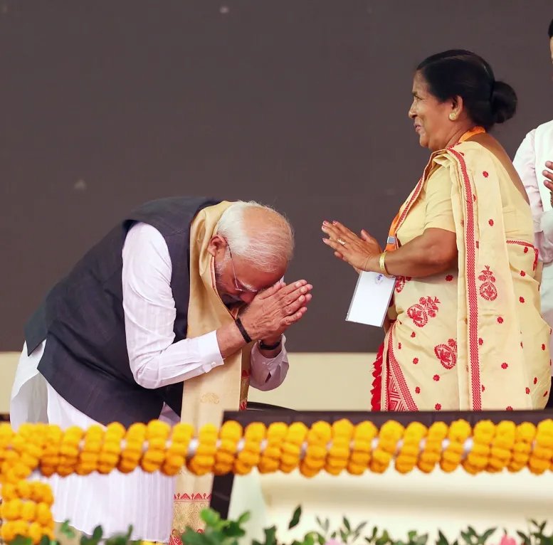 प्रधानमंत्री नरेंद्र मोदी असम के दरांग में एक सार्वजनिक कार्यक्रम के दौरान कई विकास कार्यों की आधारशिला रखने और उद्घाटन के दौरान एक वरिष्ठ महिला से आशीर्वाद लेते हुए।
