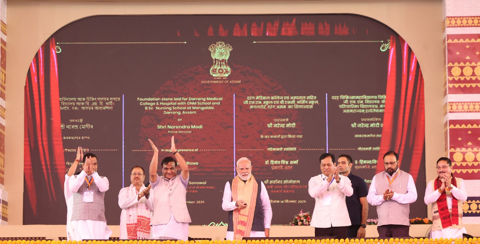 प्रधानमंत्री नरेंद्र मोदी असम के दरांग में एक सार्वजनिक कार्यक्रम के दौरान कई विकास कार्यों का शिलान्यास और उद्घाटन करते हुए। इस अवसर पर असम के मुख्यमंत्री हिमंत बिस्वा सरमा, केंद्रीय मंत्री सर्बानंद सोनोवाल और अन्य लोग मौजूद थे।