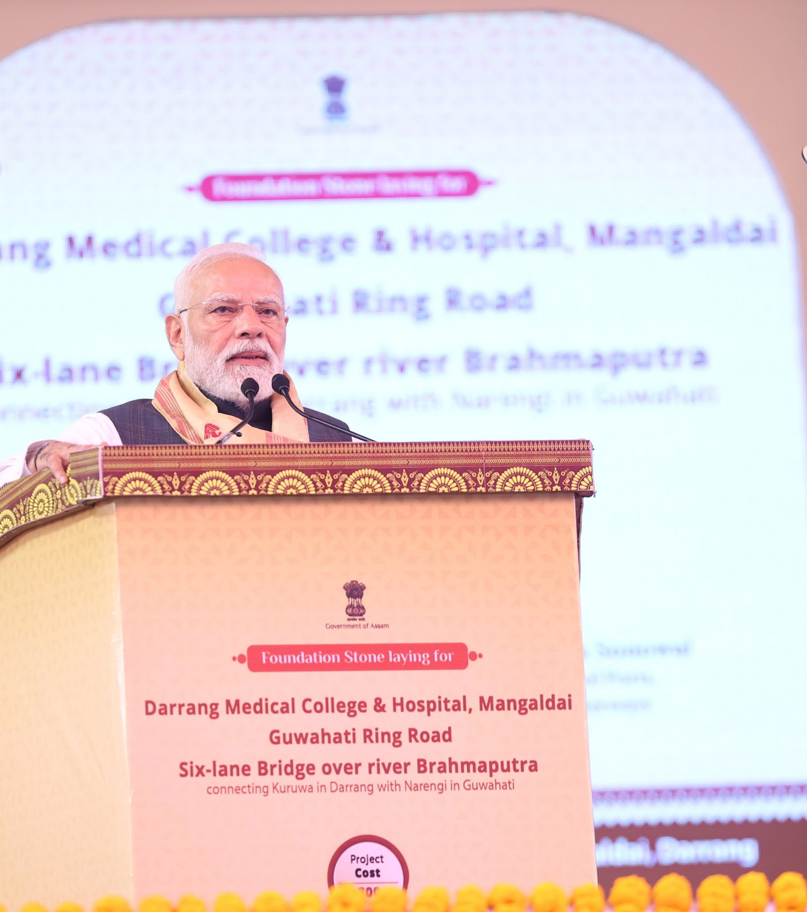 प्रधानमंत्री नरेंद्र मोदी असम के दरांग में एक सार्वजनिक कार्यक्रम के दौरान कई विकास कार्यों की आधारशिला रखने और उद्घाटन के दौरान दर्शकों को संबोधित करते हुए।