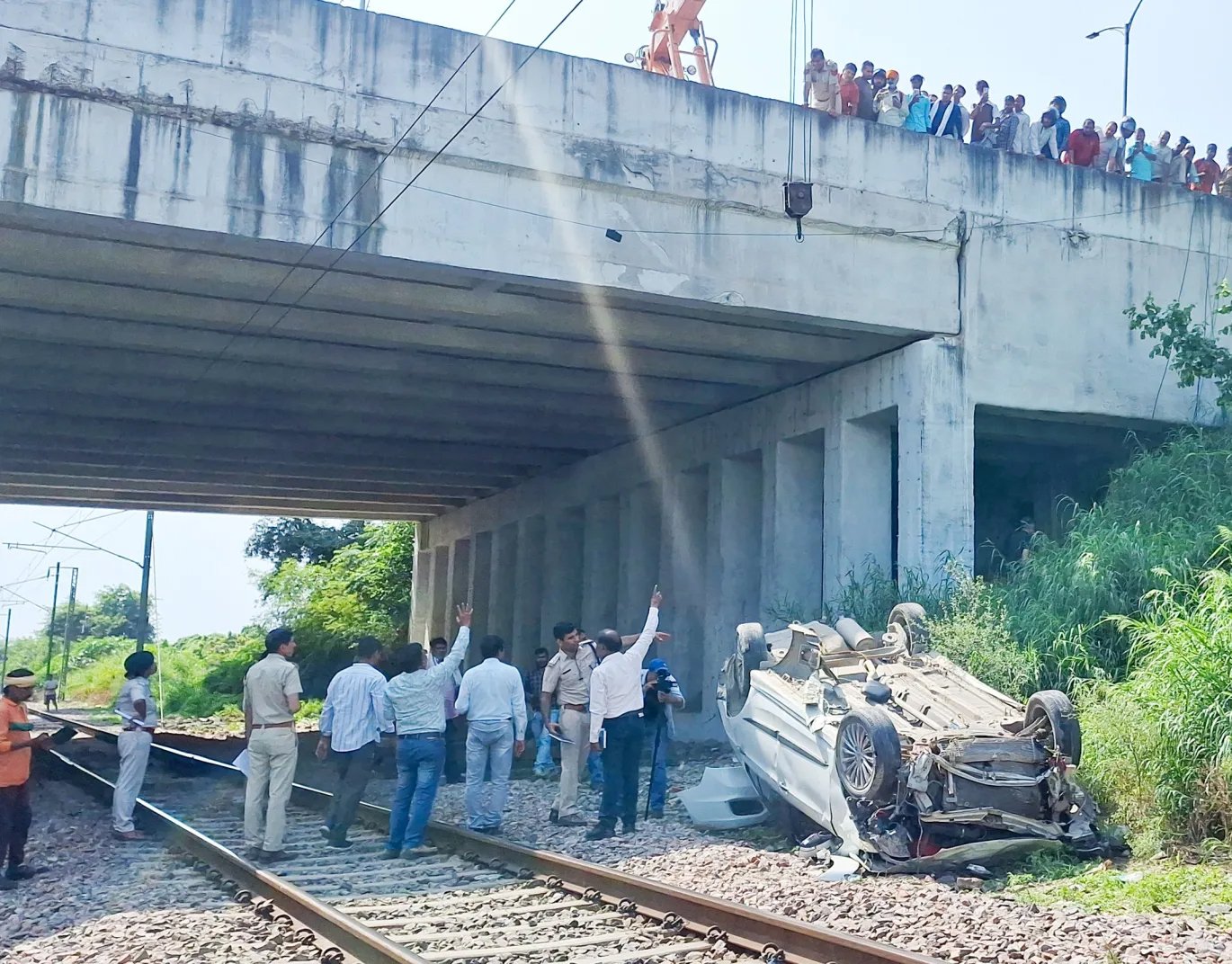 नई दिल्ली में मुकरवा चौक फ्लाईओवर के पास रेलवे ओवरब्रिज पर एक तेज रफ्तार सियाज कार के नियंत्रण खो देने और रेलवे ट्रैक पर गिर जाने के बाद घटनास्थल पर एकत्रित पुलिसकर्मी और लोग।