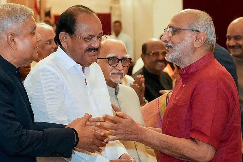 नई दिल्ली में राष्ट्रपति भवन में भारत के 15वें उपराष्ट्रपति के रूप में शपथ ग्रहण समारोह के दौरान नवनिर्वाचित उपराष्ट्रपति सीपी राधाकृष्णन, पूर्व उपराष्ट्रपति जगदीप धनखड़ और एम वेंकैया नायडू के साथ।