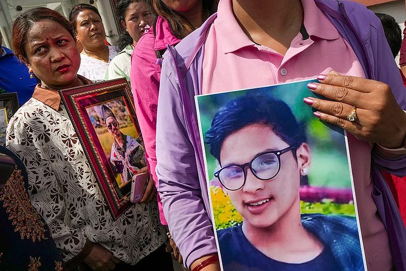 नेपाल के काठमांडू में सुरक्षा बलों की गोलीबारी में मारे गए लोगों के परिवार के सदस्य नेपाल सेना मुख्यालय के बाहर विरोध प्रदर्शन के दौरान तस्वीरें लिए हुए हैं।