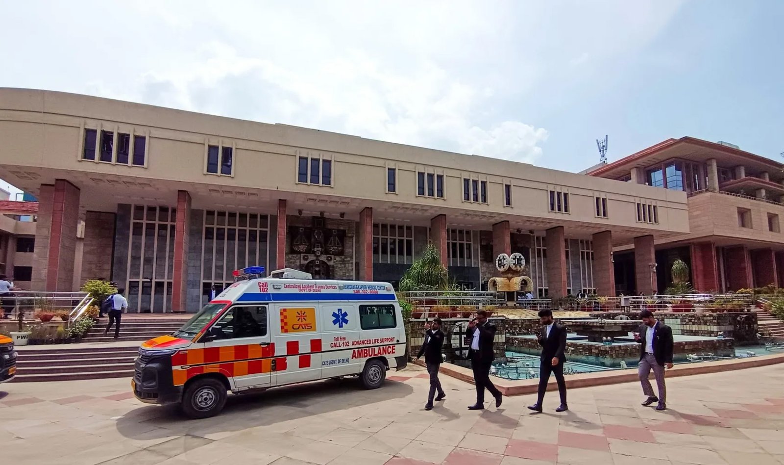नई दिल्ली में बम की धमकी के बाद कई बेंचों के अचानक उठ जाने के बाद दिल्ली उच्च न्यायालय के बाहर खड़ी एक एम्बुलेंस।